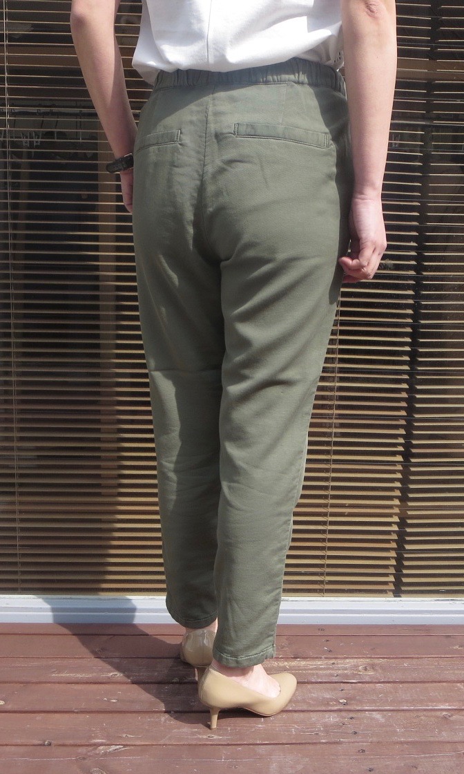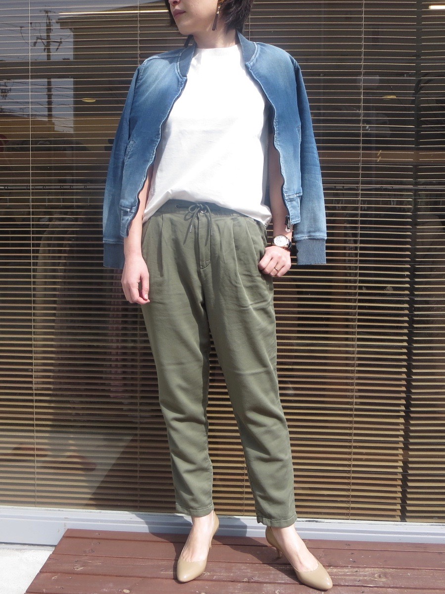 2タックのパンツは、バランスの良いテーパードながら、ウエストのゴムと柔らかい穿き心地で、ストレスフリー。