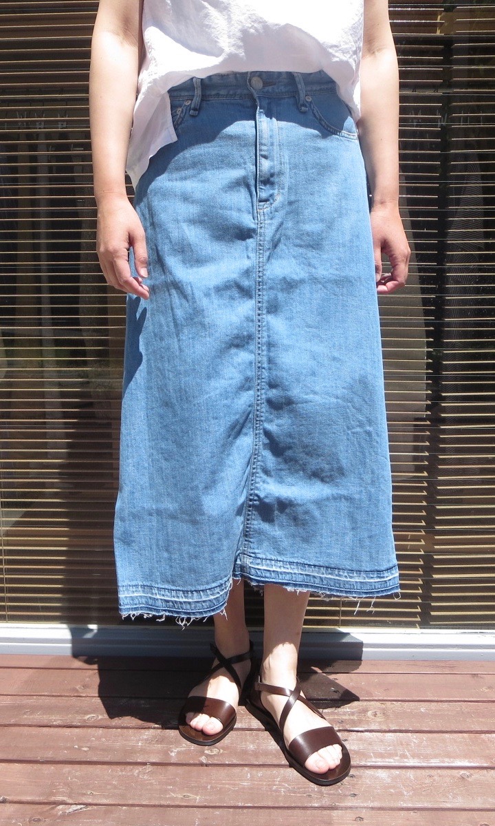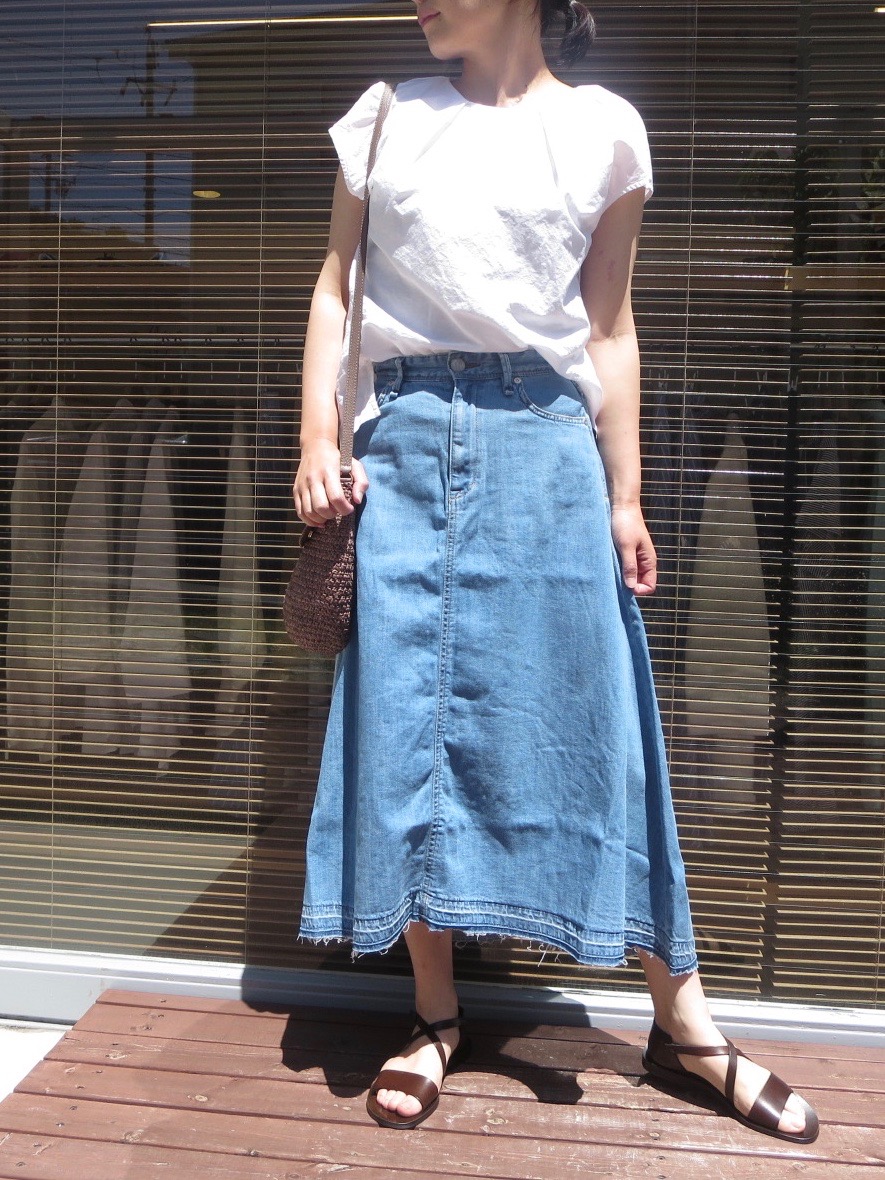 少し長めのミモレ丈で今年らしいAラインのフレアスカート。しっかりとしたウォッシュ感と裾加工で、程よい抜け感を感じさせてくれます。ハイウエスト&フレアシルエットでトップスをインして着るだけで、トレンドを盛り込んだスタイルの出来上がりです。