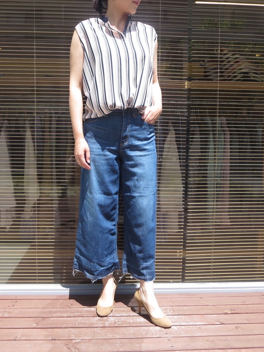 一般的なデニムよりもシャリ感があり、軽量感のある生地で、これから夏に向けて快適に穿いていただけるデニムになっています。ハイウエストになっていますので、トップスは少しインすると脚長効果も得られます。