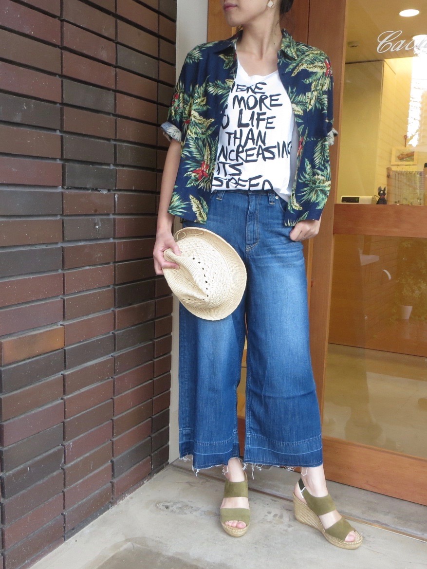 このアロハシャツは、ゆったりとしたシルエットで丈が短いのが最大のポイント。ボリュームのあるボトムと合わせることで、リゾート感が抑えられ、ぐっと普段遣いがしやすくなります。