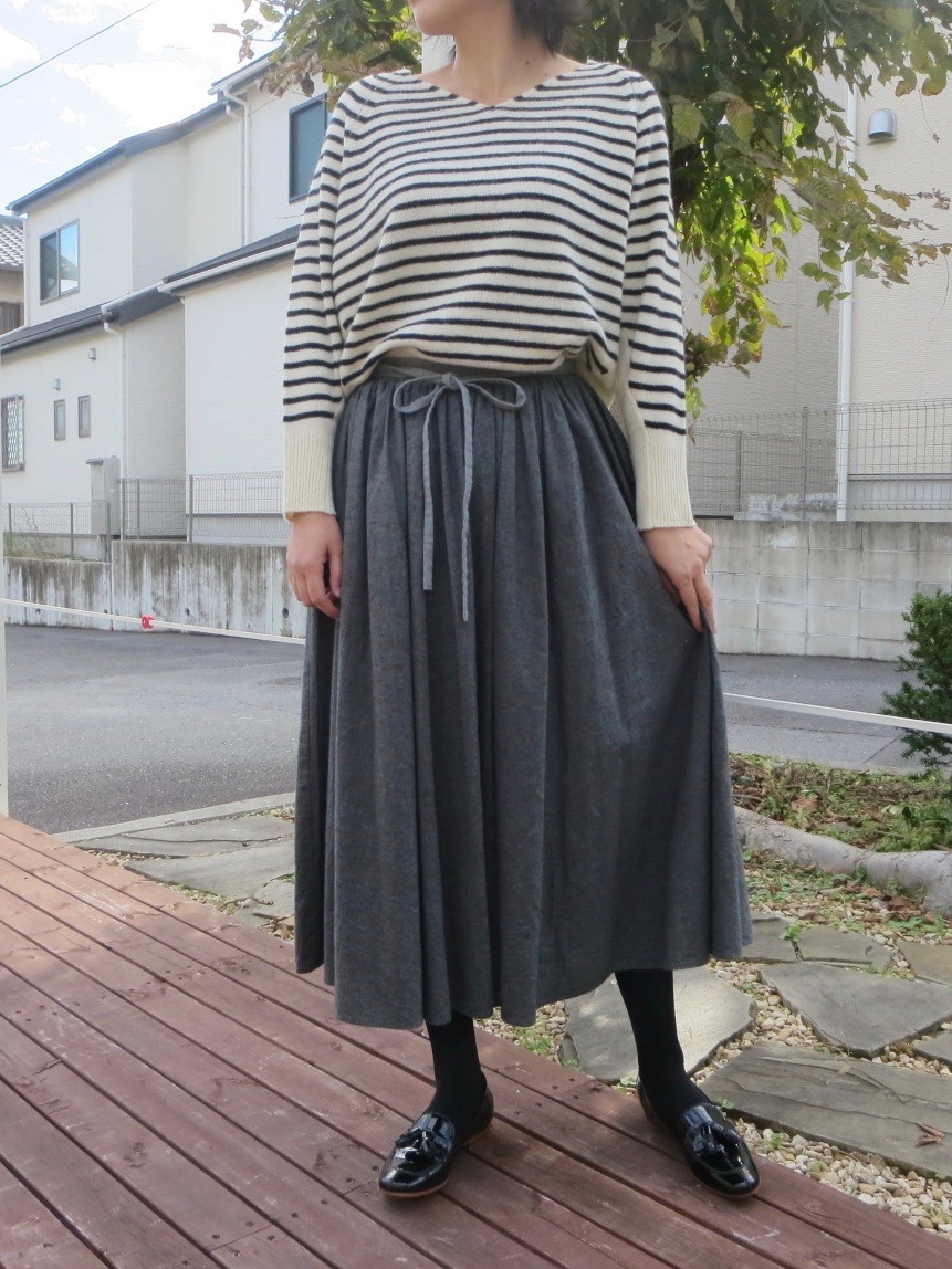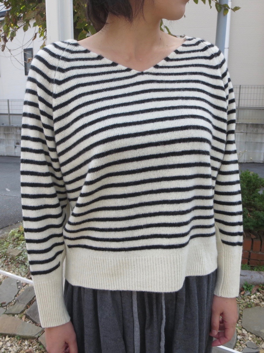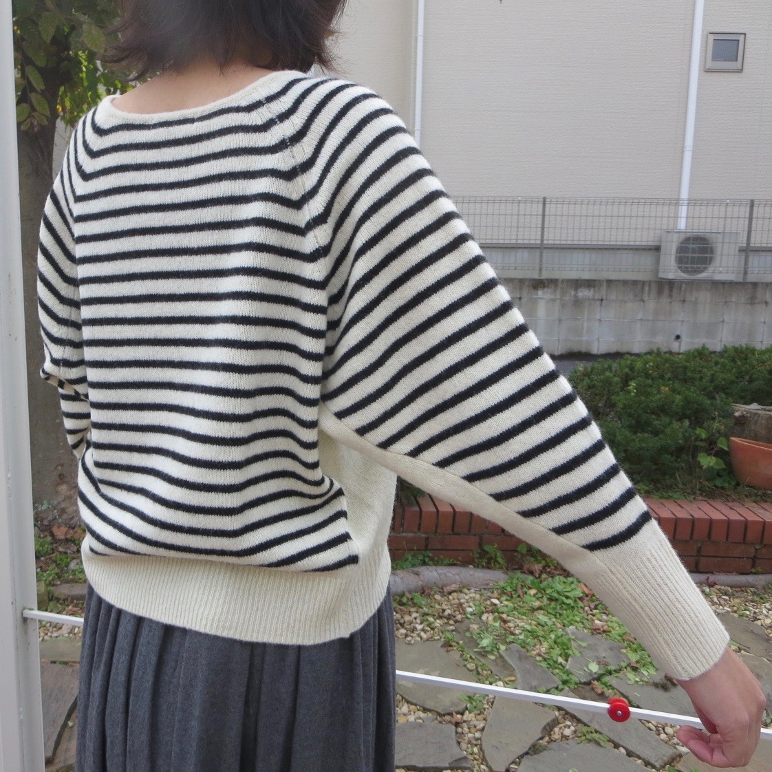 上でご紹介したベージュのニットと同モデルのボーダーバージョン。ナチュラルなカジュアルスタイルを楽しめます。