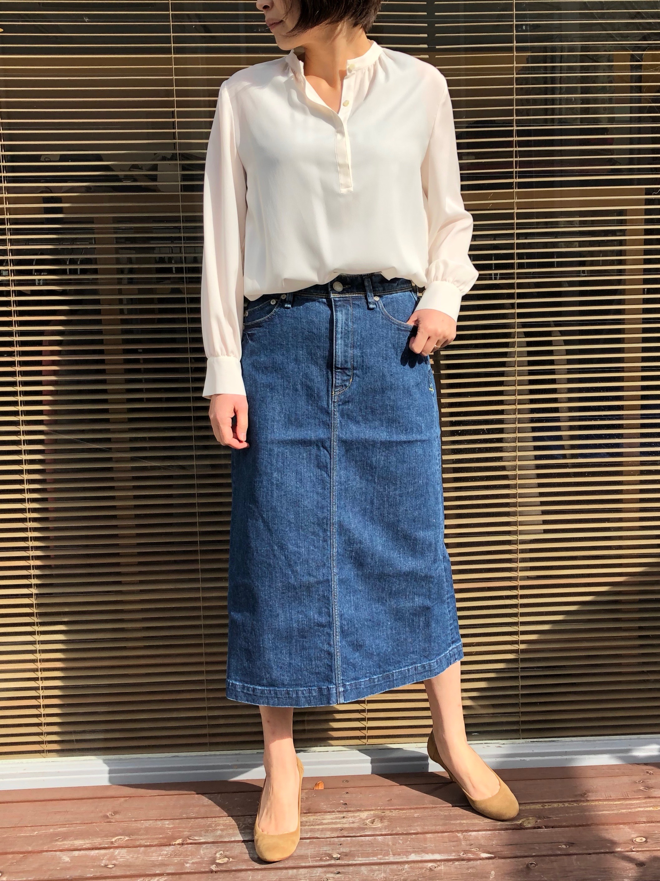 『YANUK』の新作スカートは、絶妙な丈感が穿きやすい大人のAラインスカートです。ハイウエストでトレンドを押さえつつ、穿いていて安定感もあるので、満足度の高いスカートです。