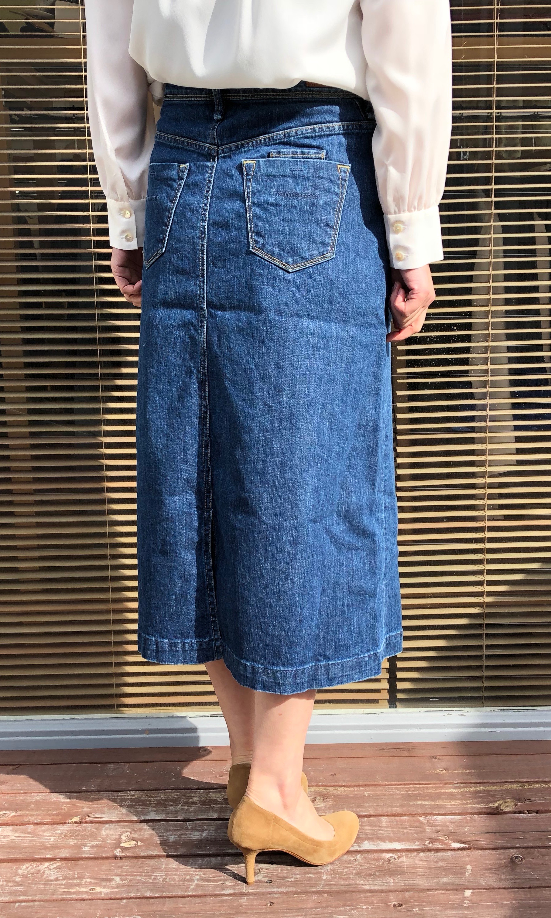 裾に向かって緩やかに広がっていくシルエットで、腰回りやヒップをすっきりとカバーしてくれます。