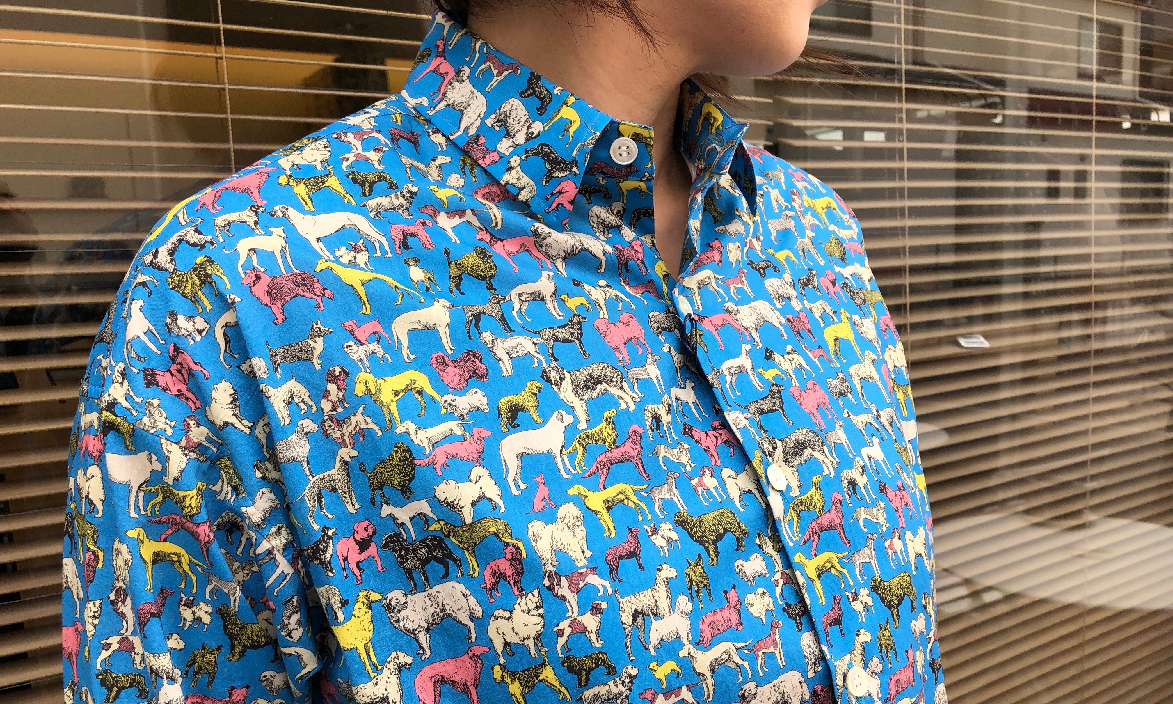 以前、『HELIOPOLE』が復活しましたと一番最初のご紹介したシャツワンピースと、同じ生地を使用したシャツが登場です。リバティのポップな犬柄が目を引く一枚です。