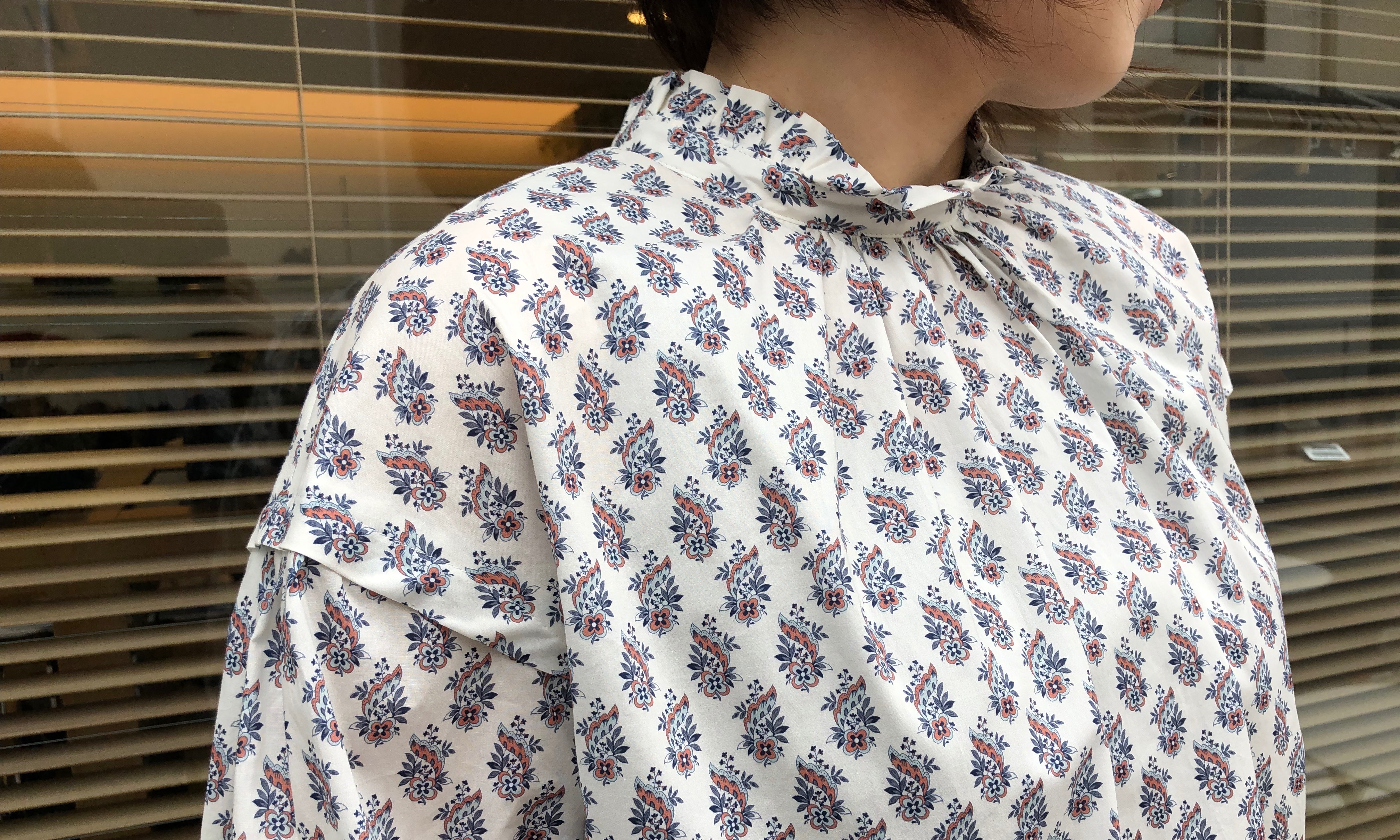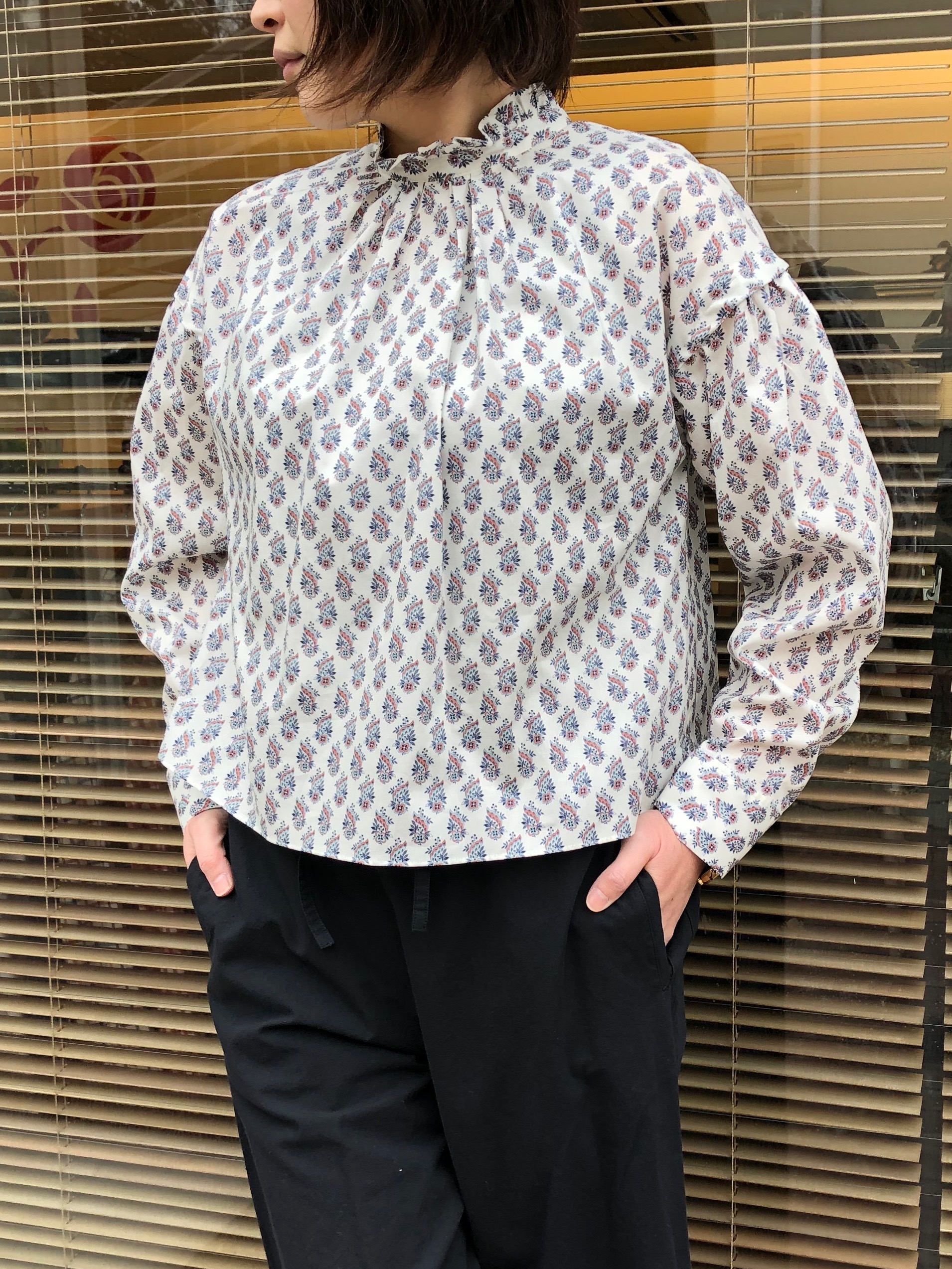 少しレトロな雰囲気が逆に新しいリバティ生地を使ったブラウス。襟ぐりや袖のギャザーでボリュームを持たせて空気をまとったかのようなデザインになっています。