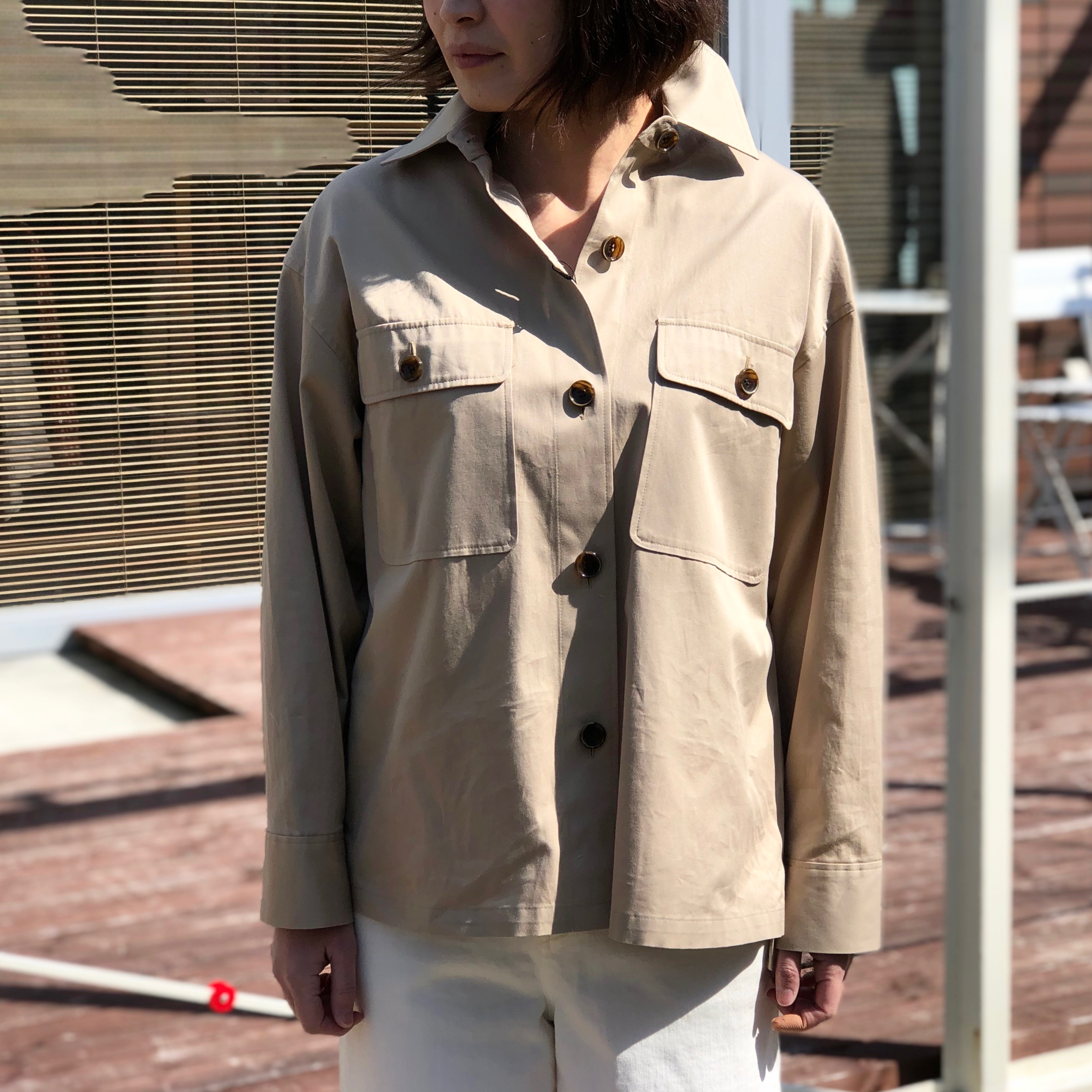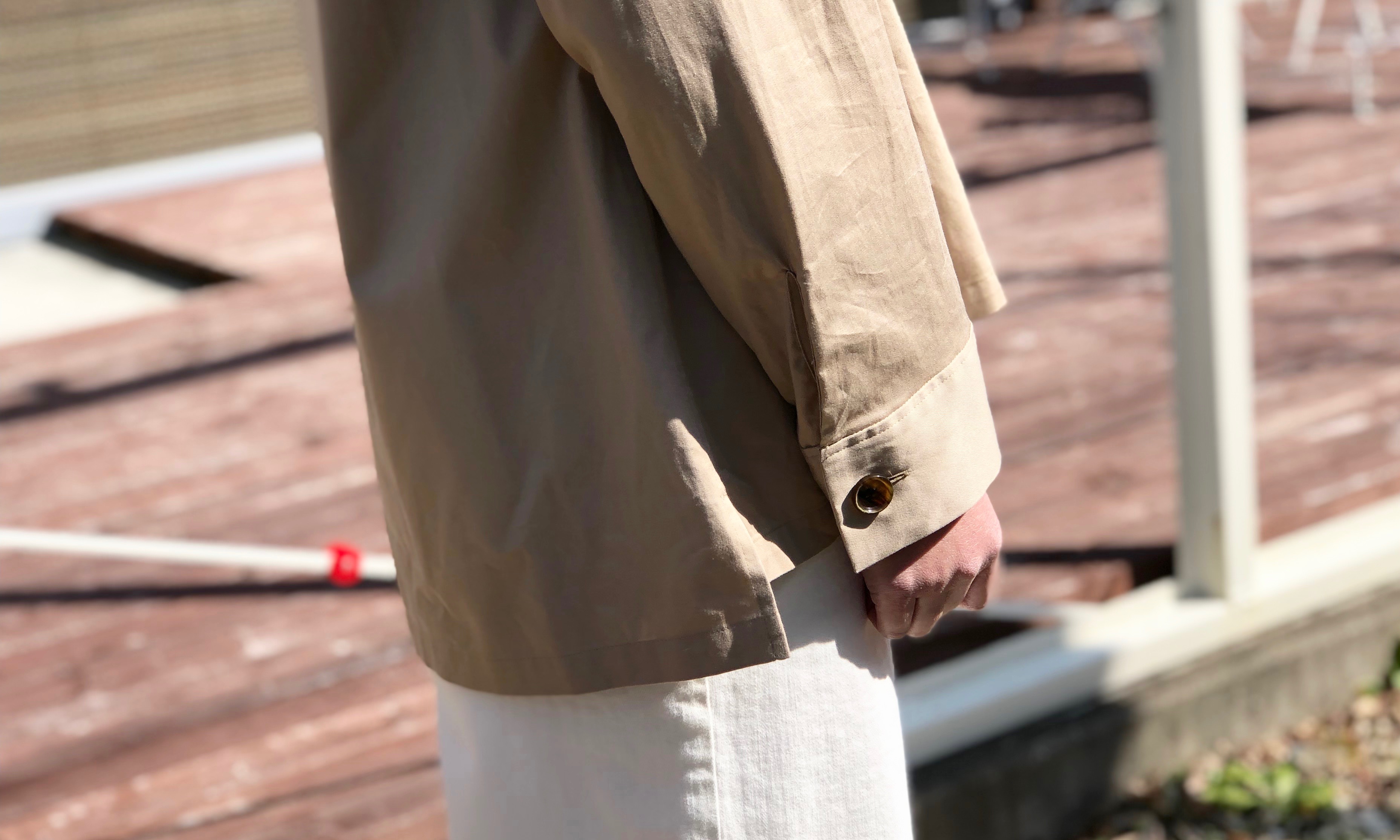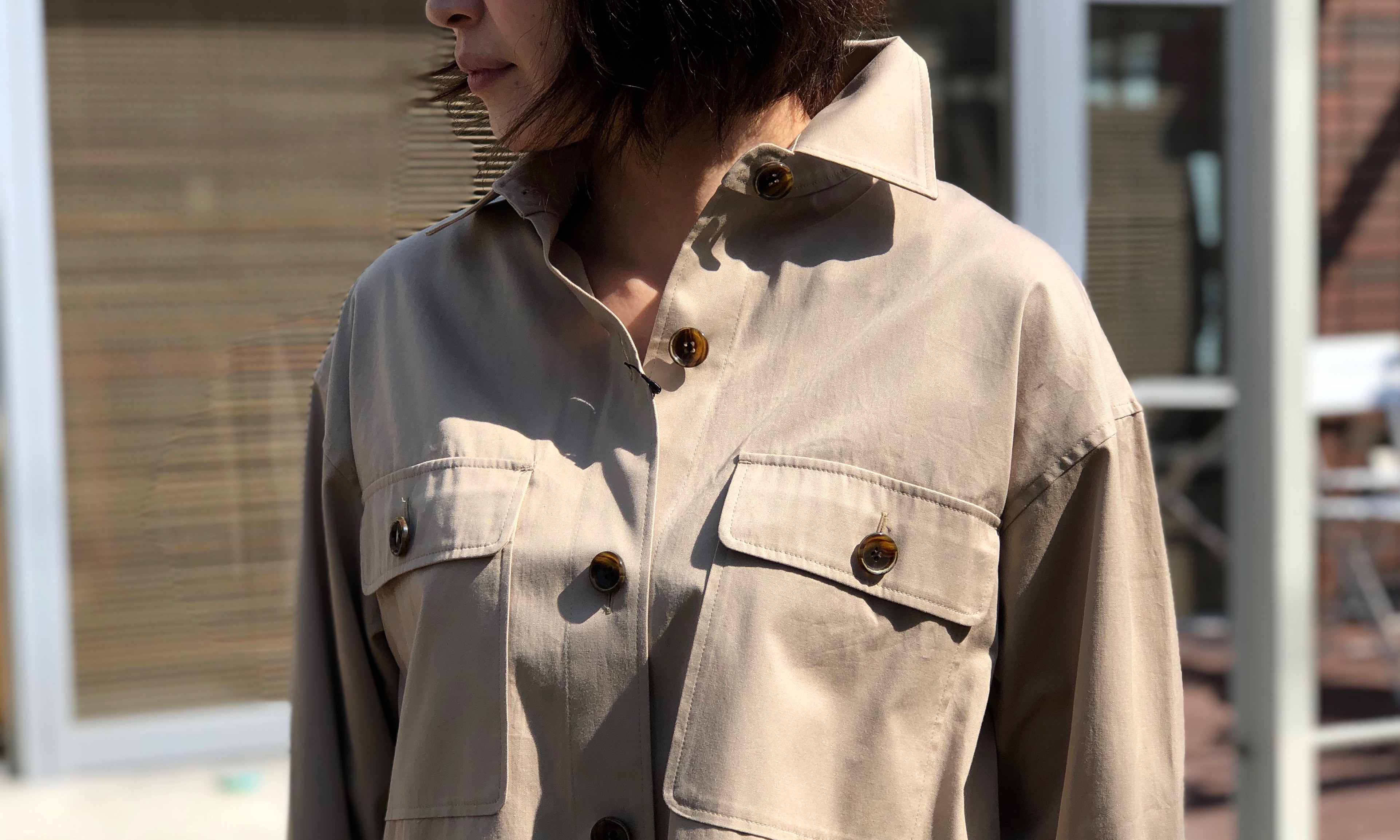 薄手のコットンツイル素材で、程よい光沢と生地感が、シャツとしてはだけでなくジャケットっぽく着こなせる一枚になっています。