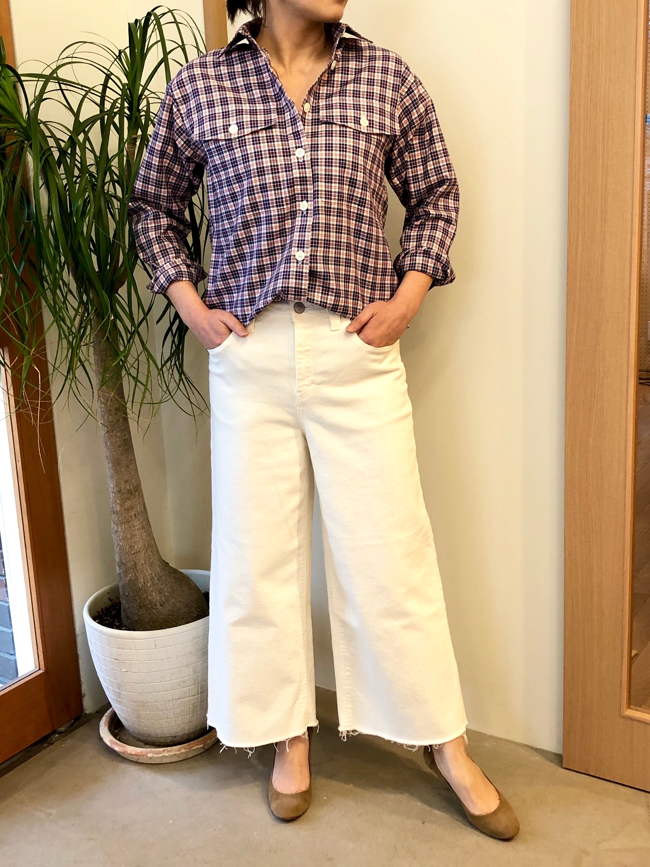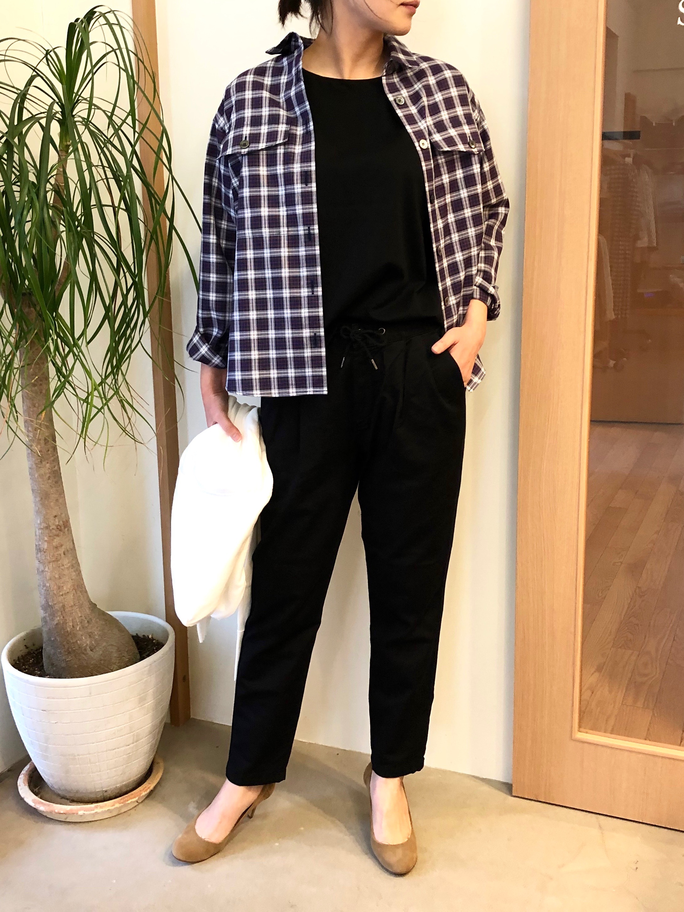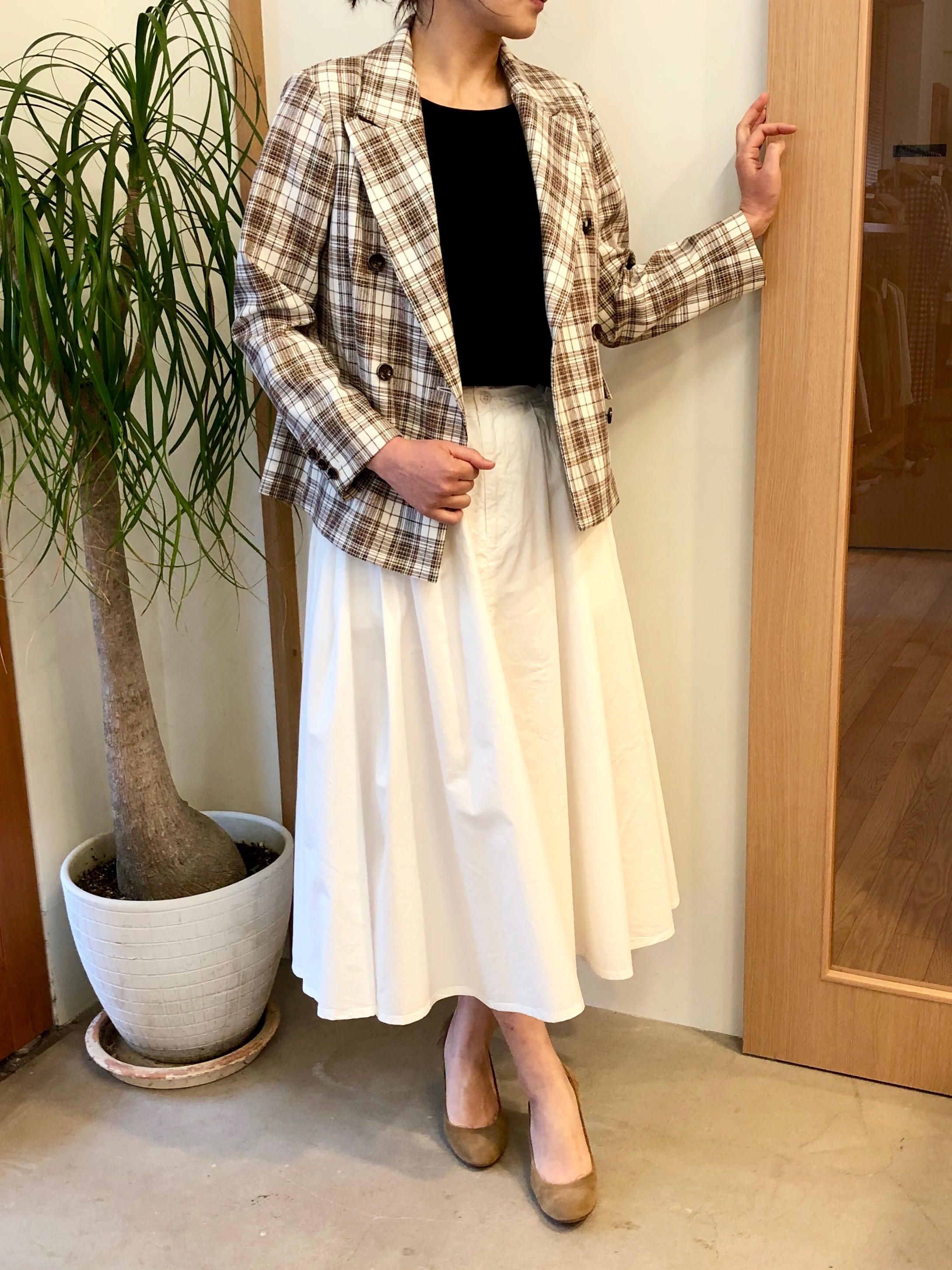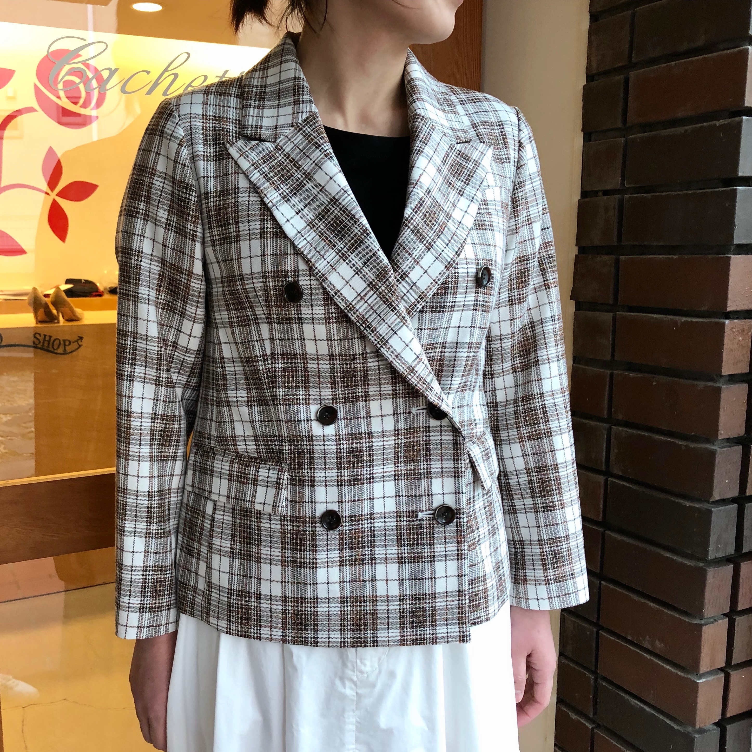 少し懐かしい雰囲気漂うチェックのショート丈ジャケット。ボリュームのあるボトムと合わせて今年っぽくコーディネートしました。