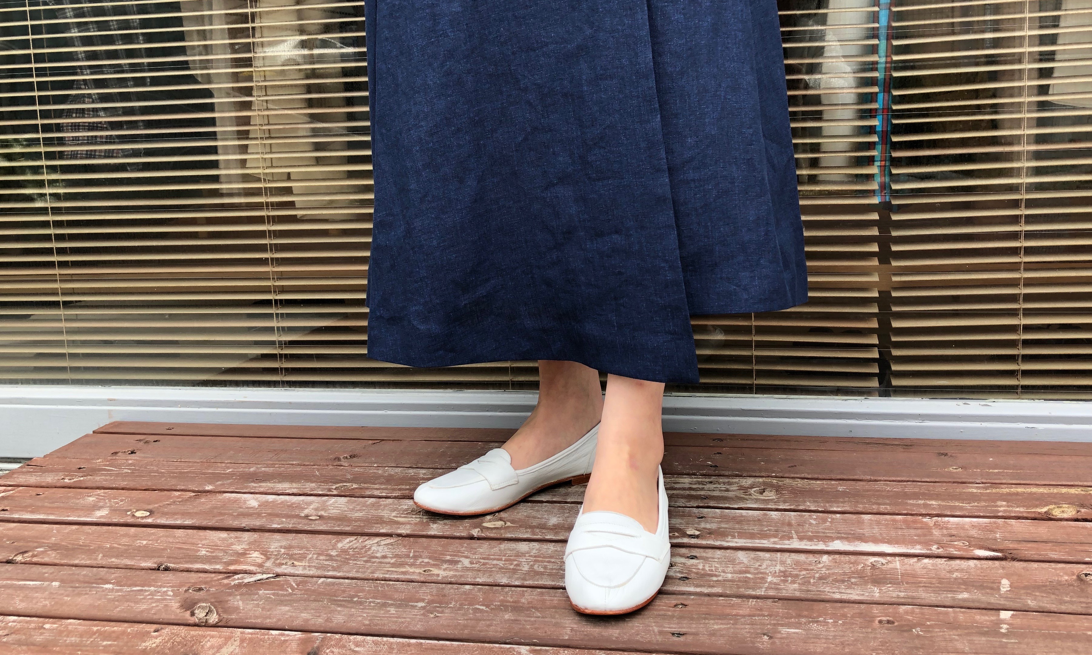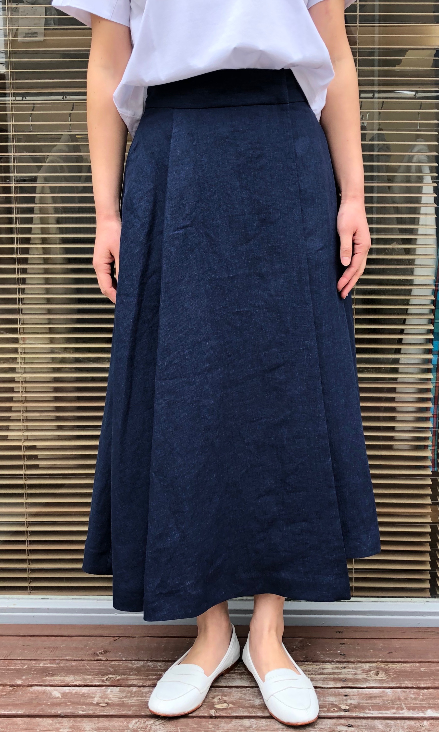 ミモレ丈で、素足を出しても安心感がりますし、腰から裾に向かって流れるようなシルエットで、すっきりと穿いていただけます。
