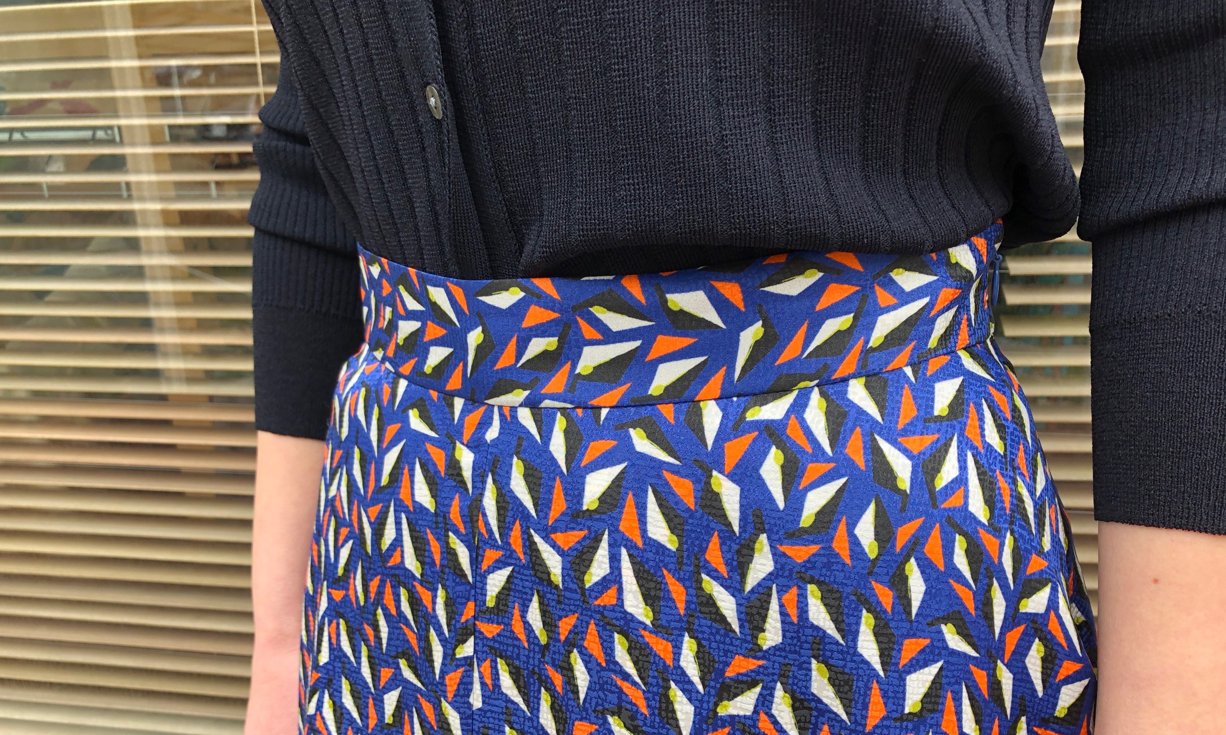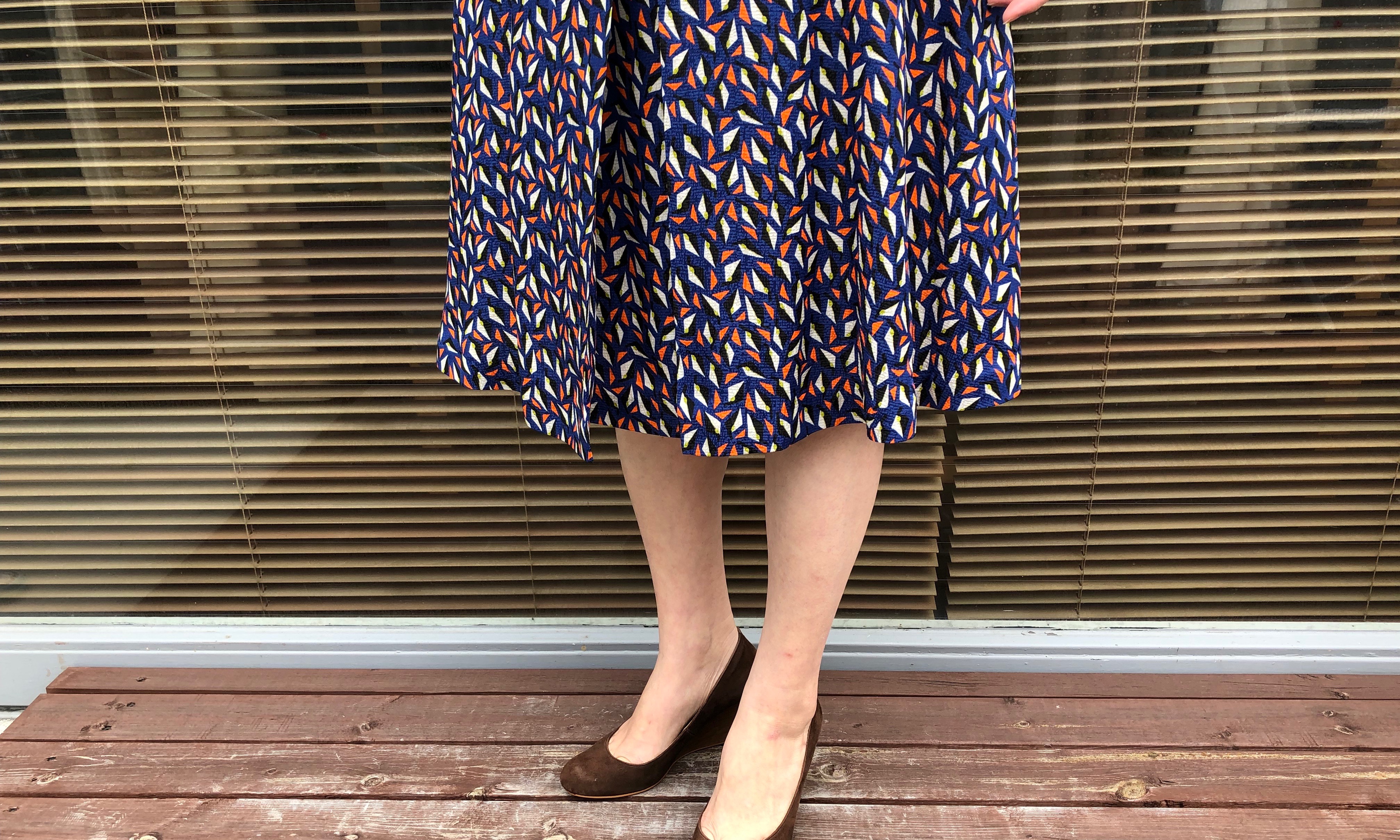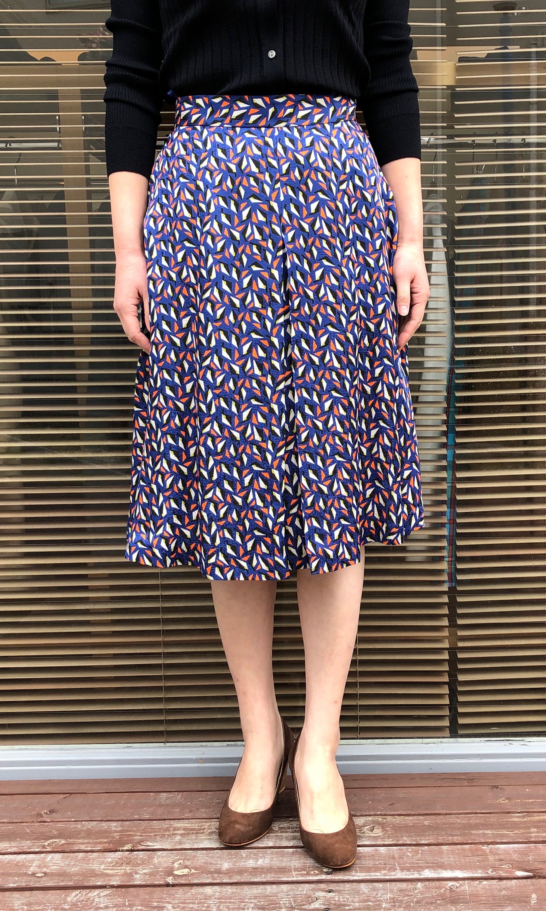 また、イメージがガラッと変わりますよね。細かな幾何学模様の膝下丈のスカートはコーディネートの主役に。