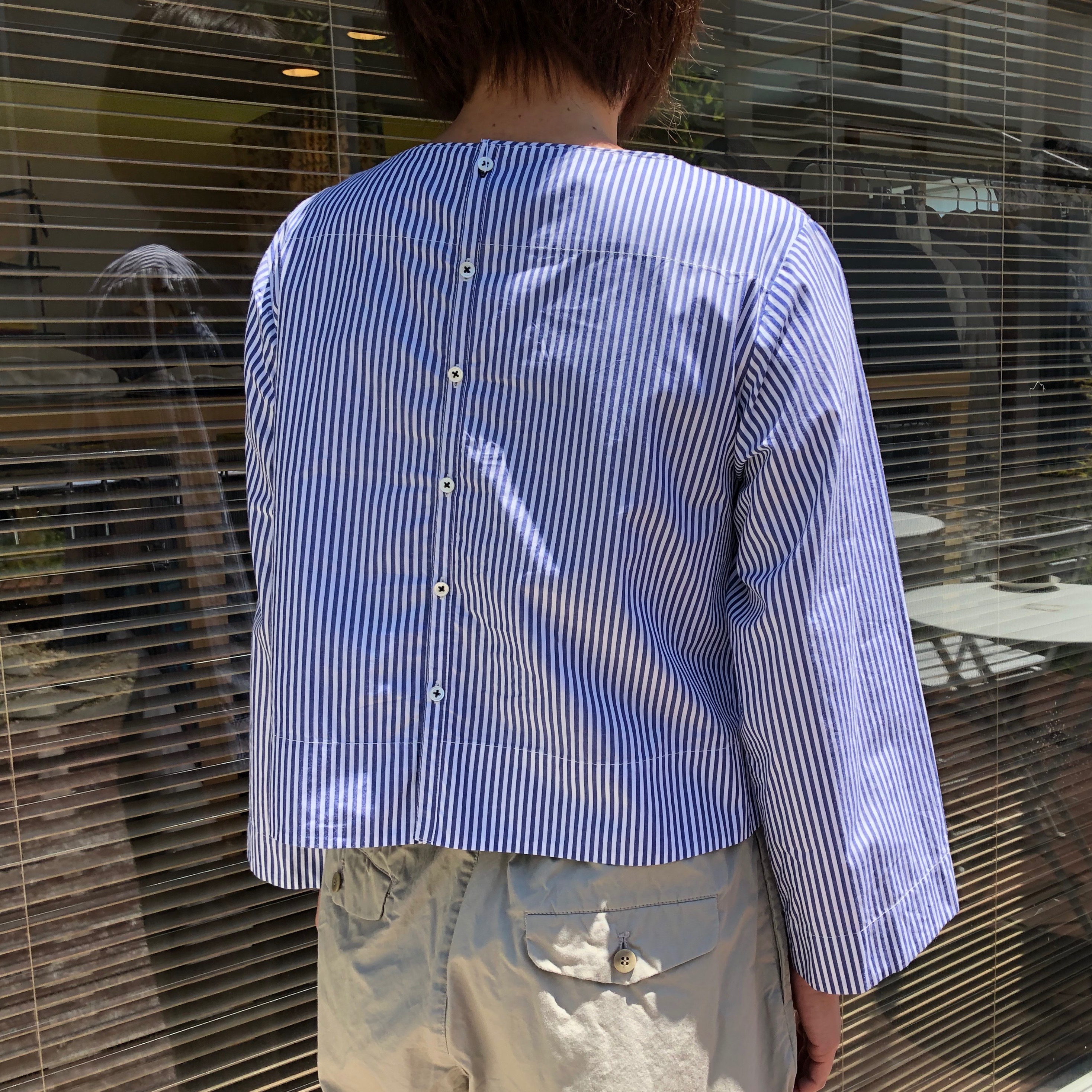 まずは、ブラウスから。全体的にゆったりとしていて、短い丈でトレンドを取り入れています。ボリュームのあるボトムとも相性が良く、バランスと取りやすい一枚になっています。