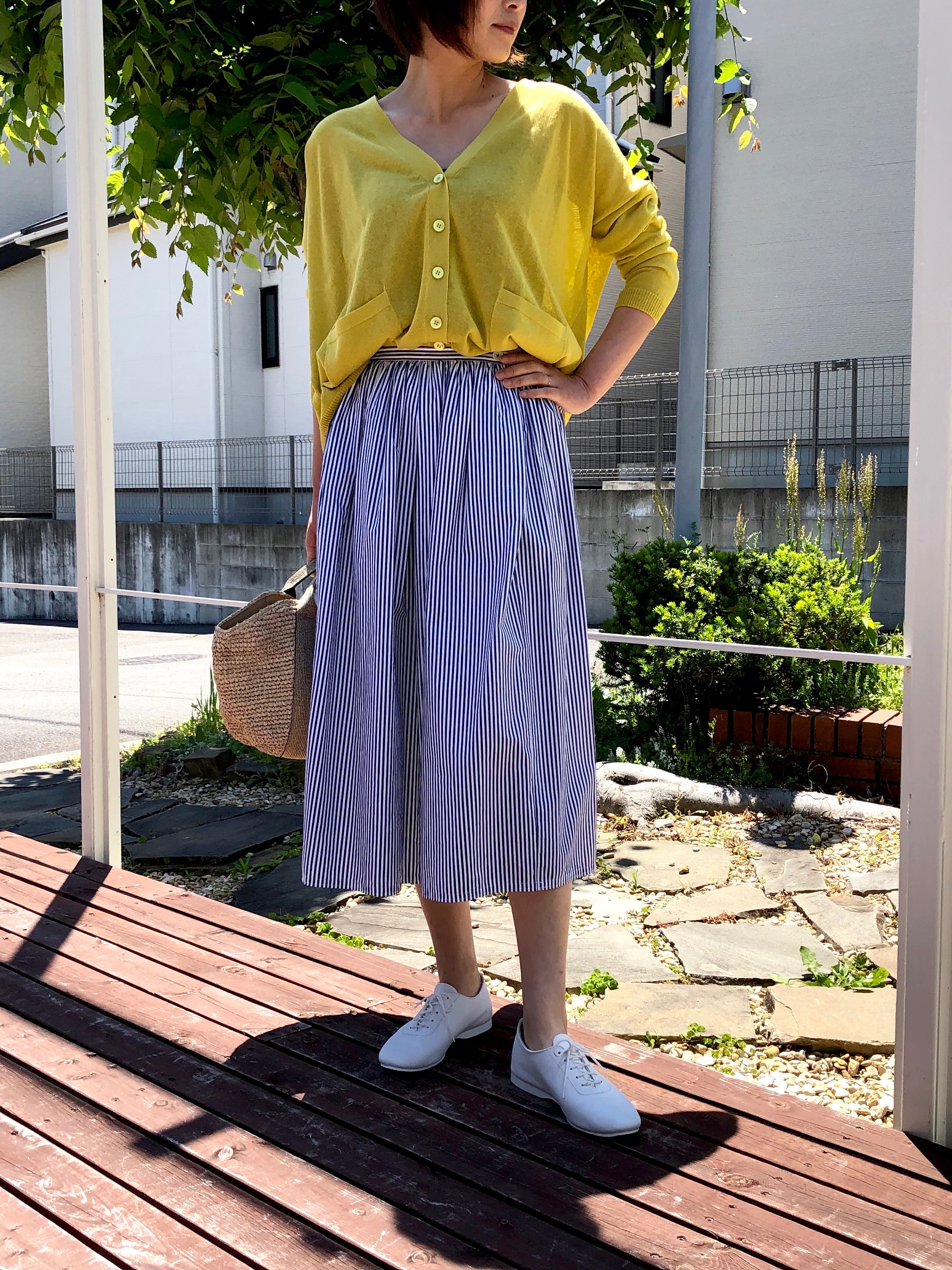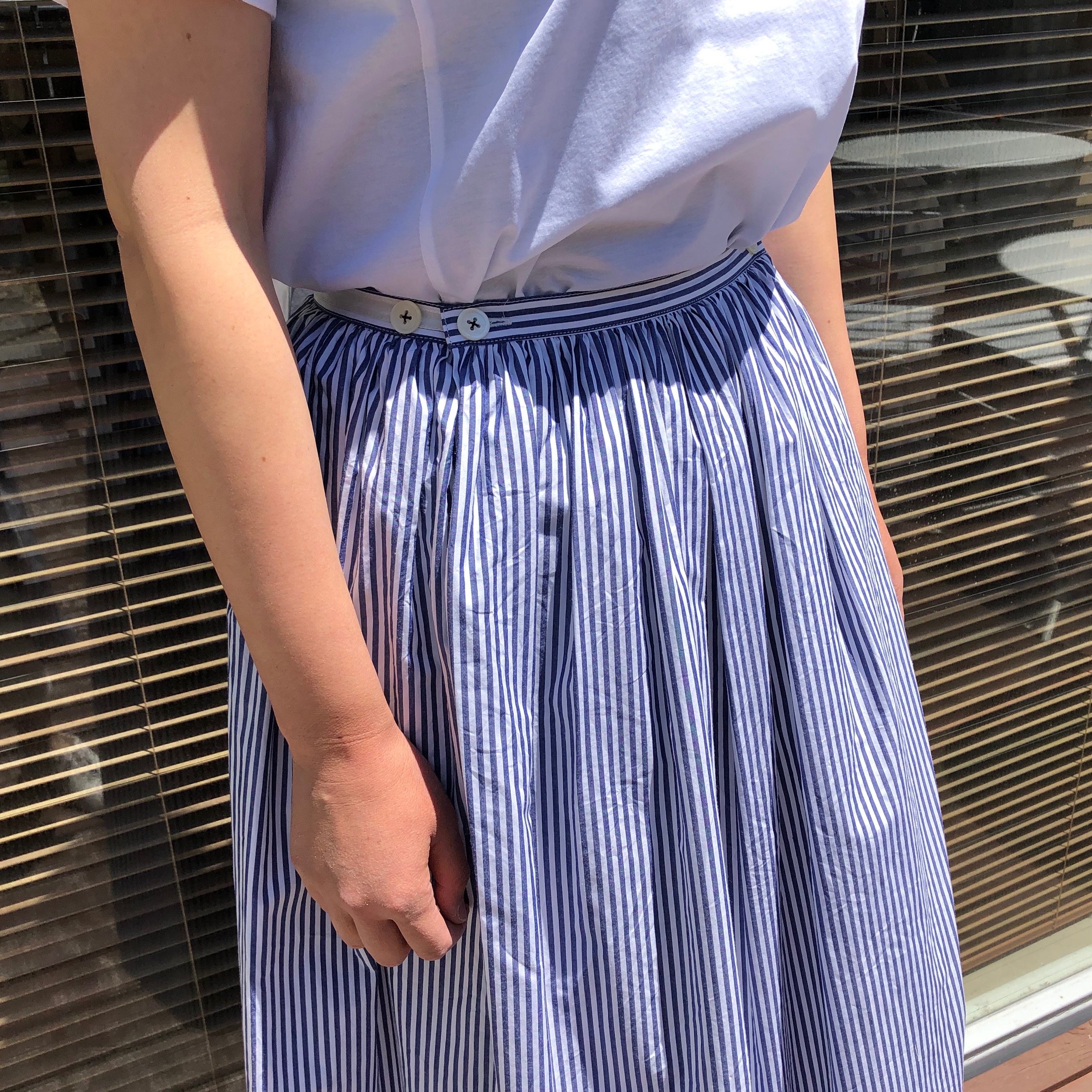 白とブルーの配色が爽やかなので、色のあるトップスと合わせても素敵です。素足を出しても安心感のある丈で、これからの季節は、ぜひサンダルと合わせていただきたいです。