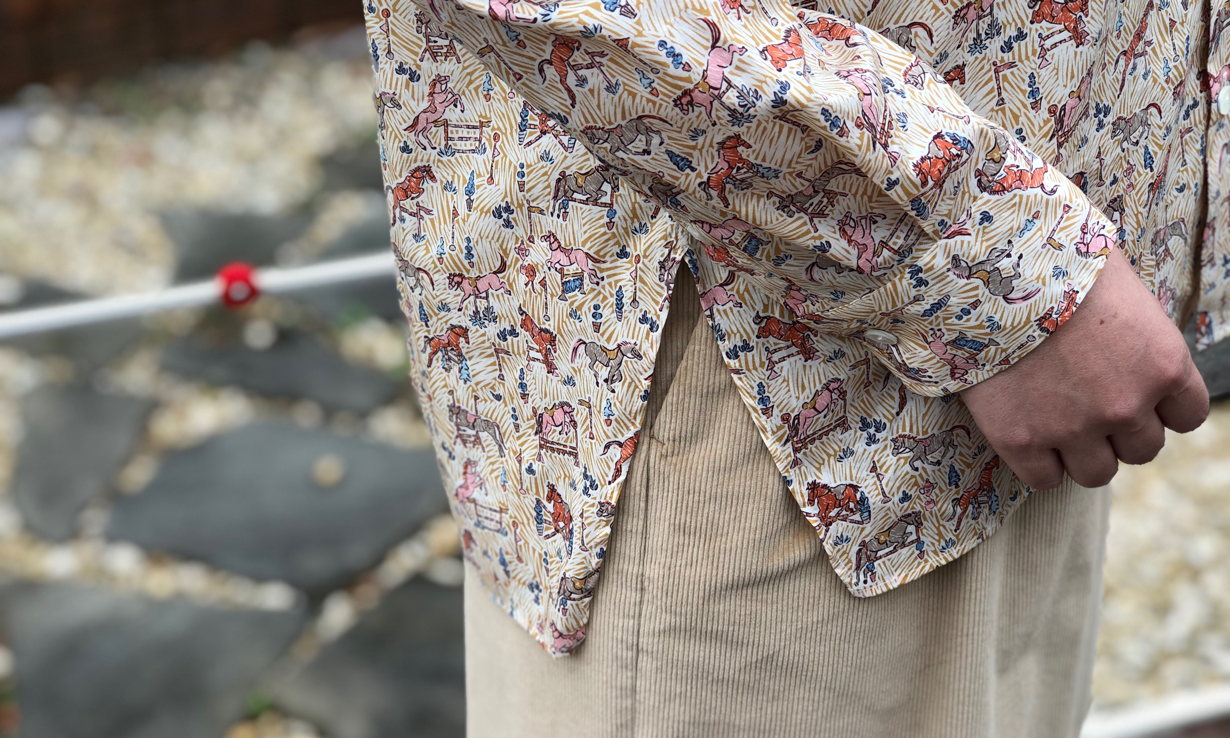 "Gymkhana ジムカーナ"と呼ばれるこの生地は、馬術競技会の様子が描かれています。少しレトロでクラシカルです。