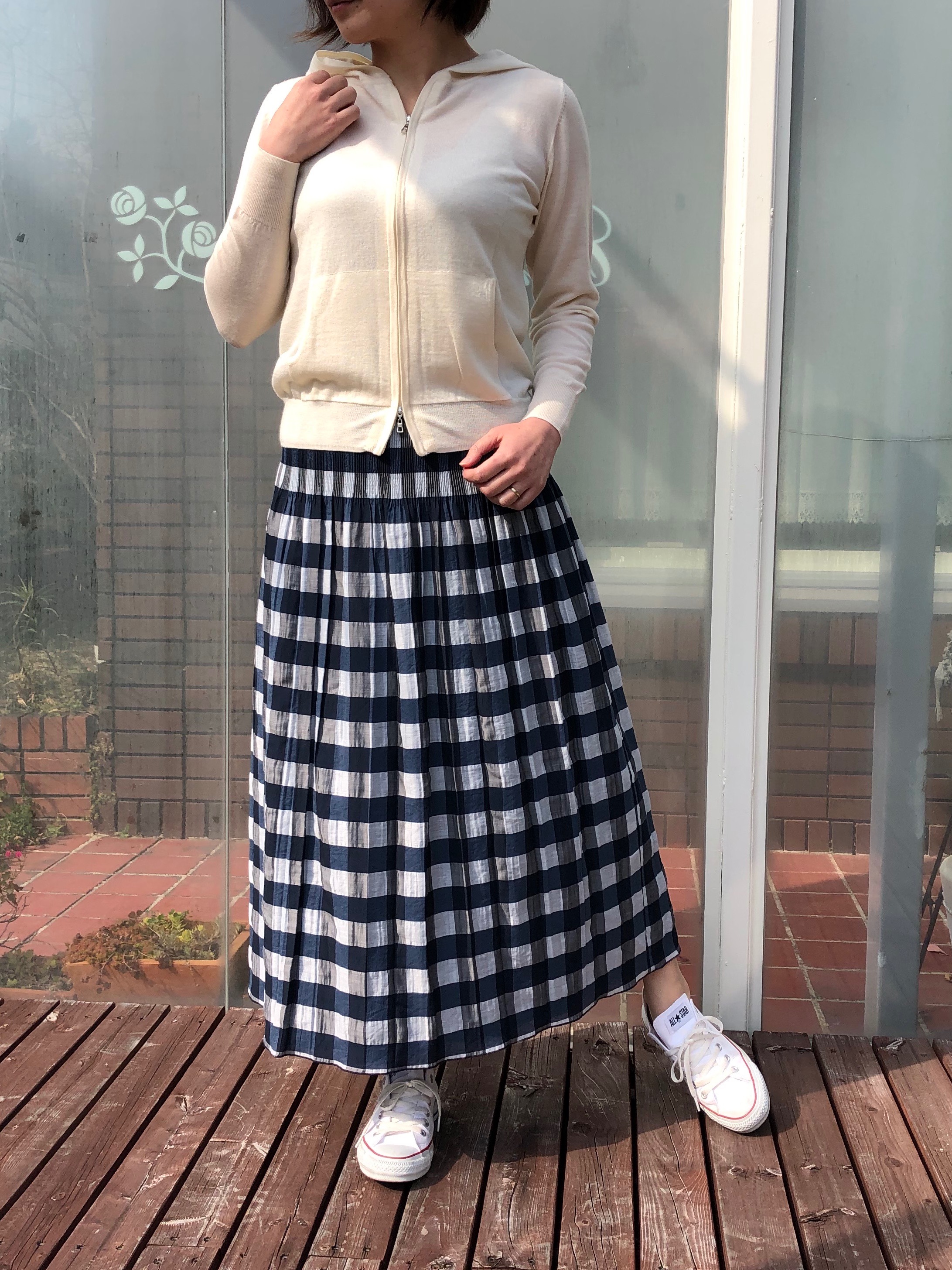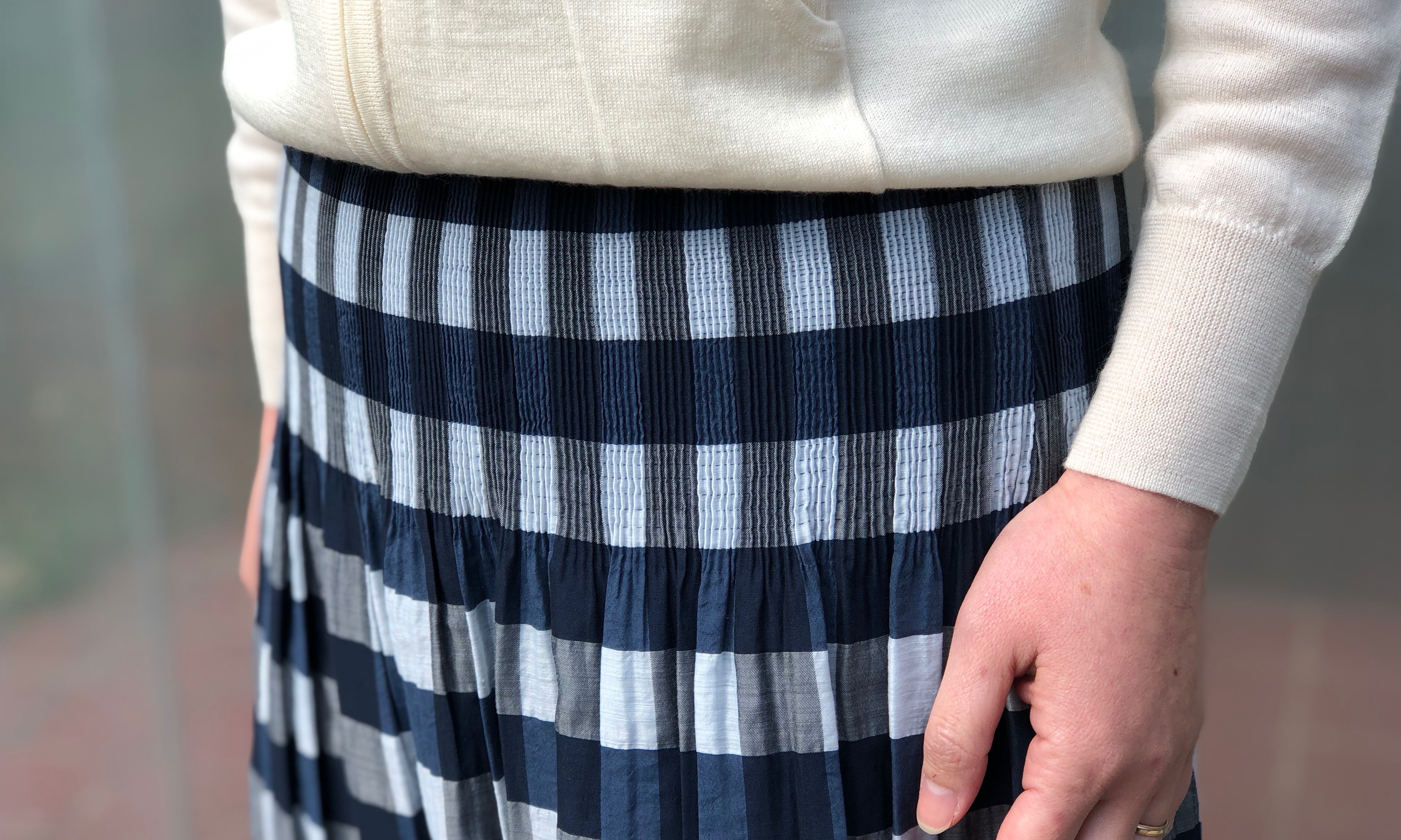 大きめのチェックが目を引くスカートは、ブルー系のグラデーションなので、ギンガムチェックでも甘くなり過ぎない仕上がりです。ボリュームも程よく、どんな身長の方にも合わせやすくなっています。