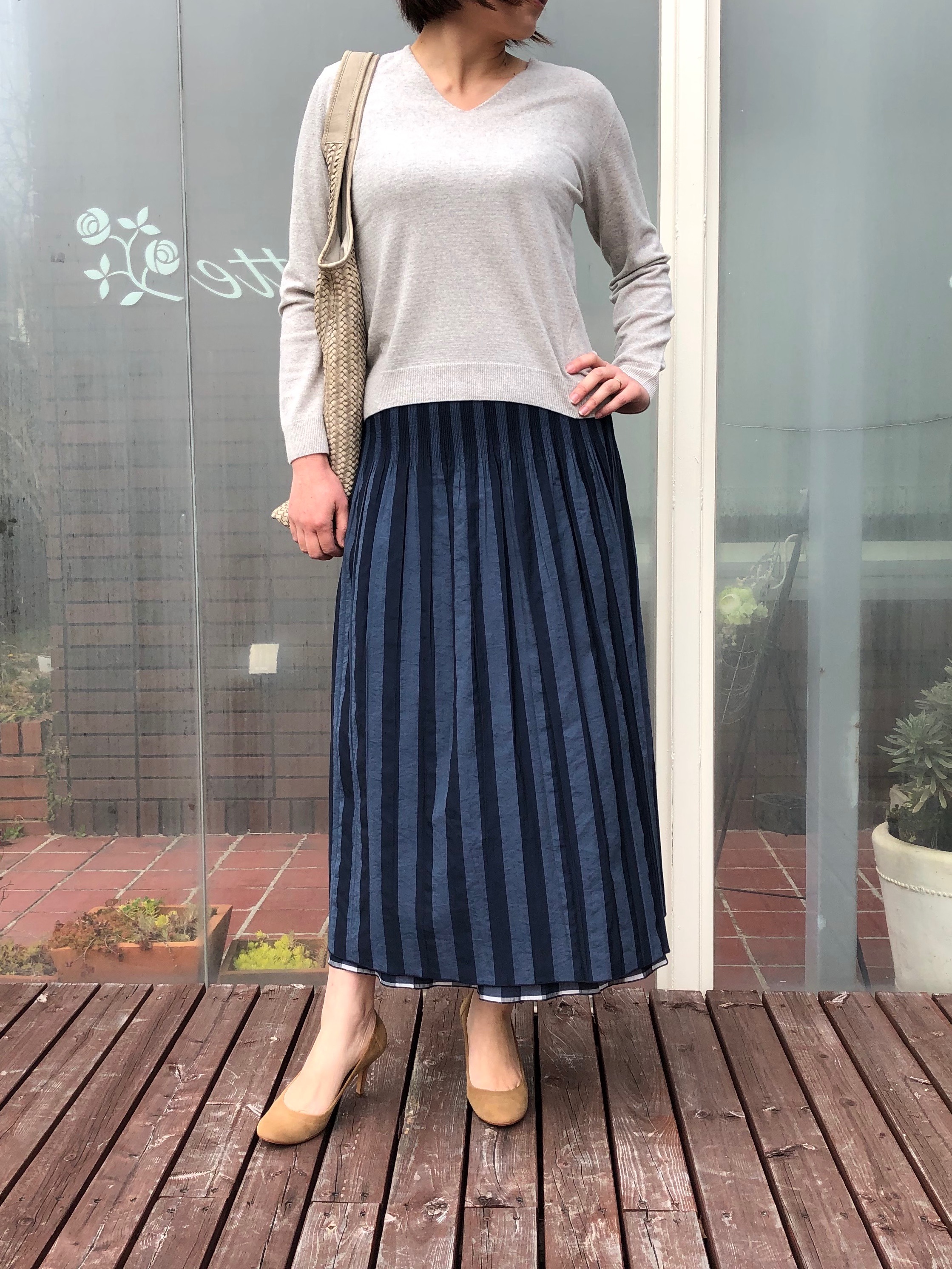 このスカートの一番の魅力は、リバーシブルスカートであること。裏返してみると、ストライプ柄に早変わりです。ずいぶんと落ち着いた雰囲気になりますね。裾から少し覗くチェック柄がアクセントになっています。