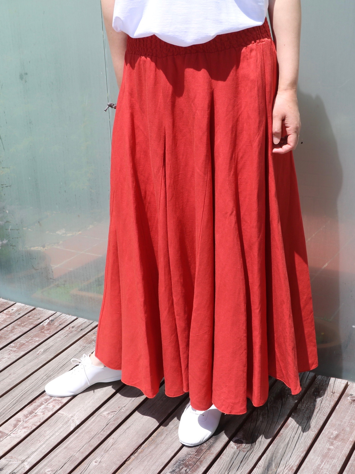 ギャザーフレアースカートなので歩くたびに裾が揺れて軽やかな印象に。裾にボリュームがありますが、実際に穿いてみるとそれほど広がりもなく、すっきりとしたシルエットになっています。