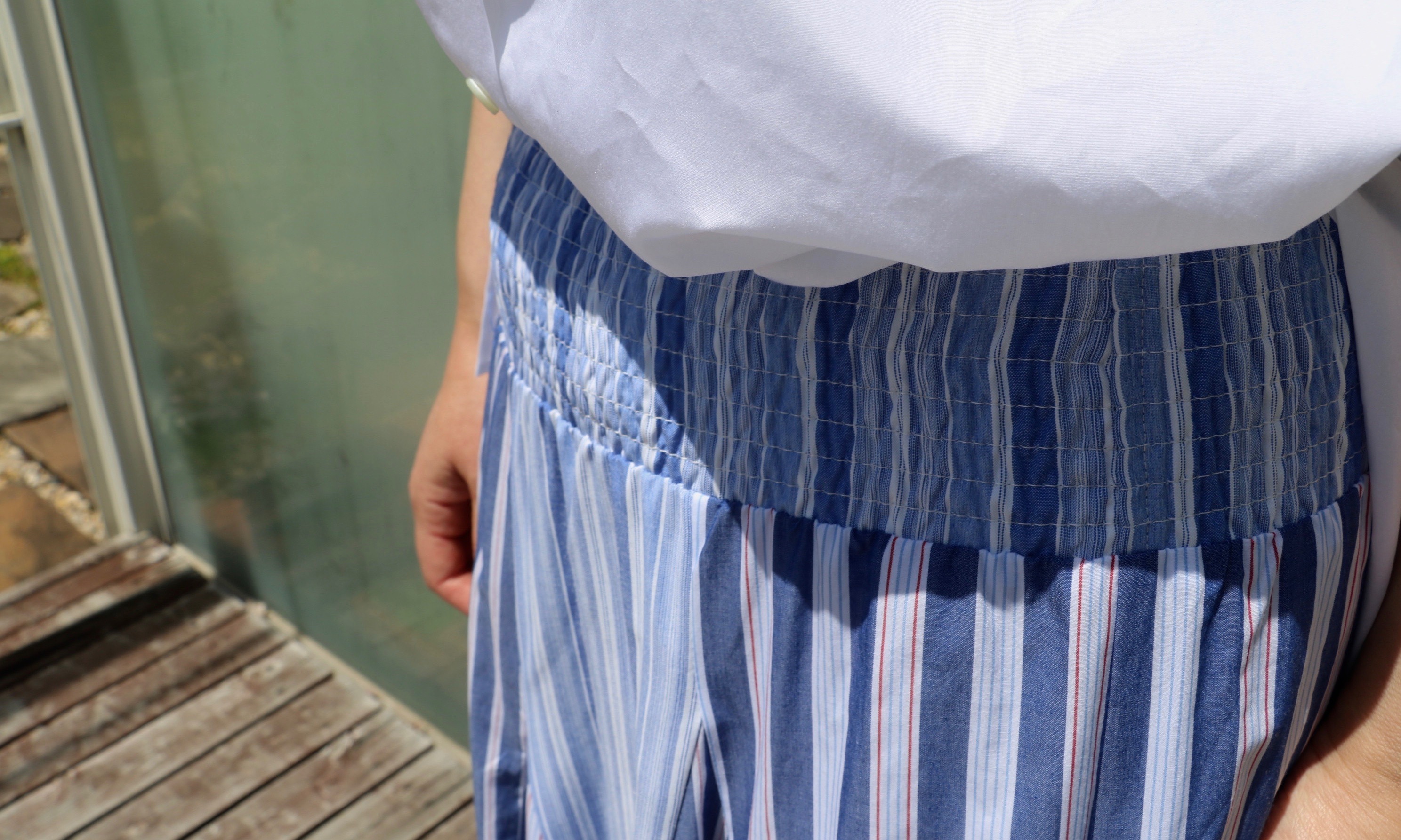コーディネートでは見えなかったですが、ウエスト部分の切り替えを見せても素敵です。また。オールゴムなので、ウエスト周りはストレスフリーです。