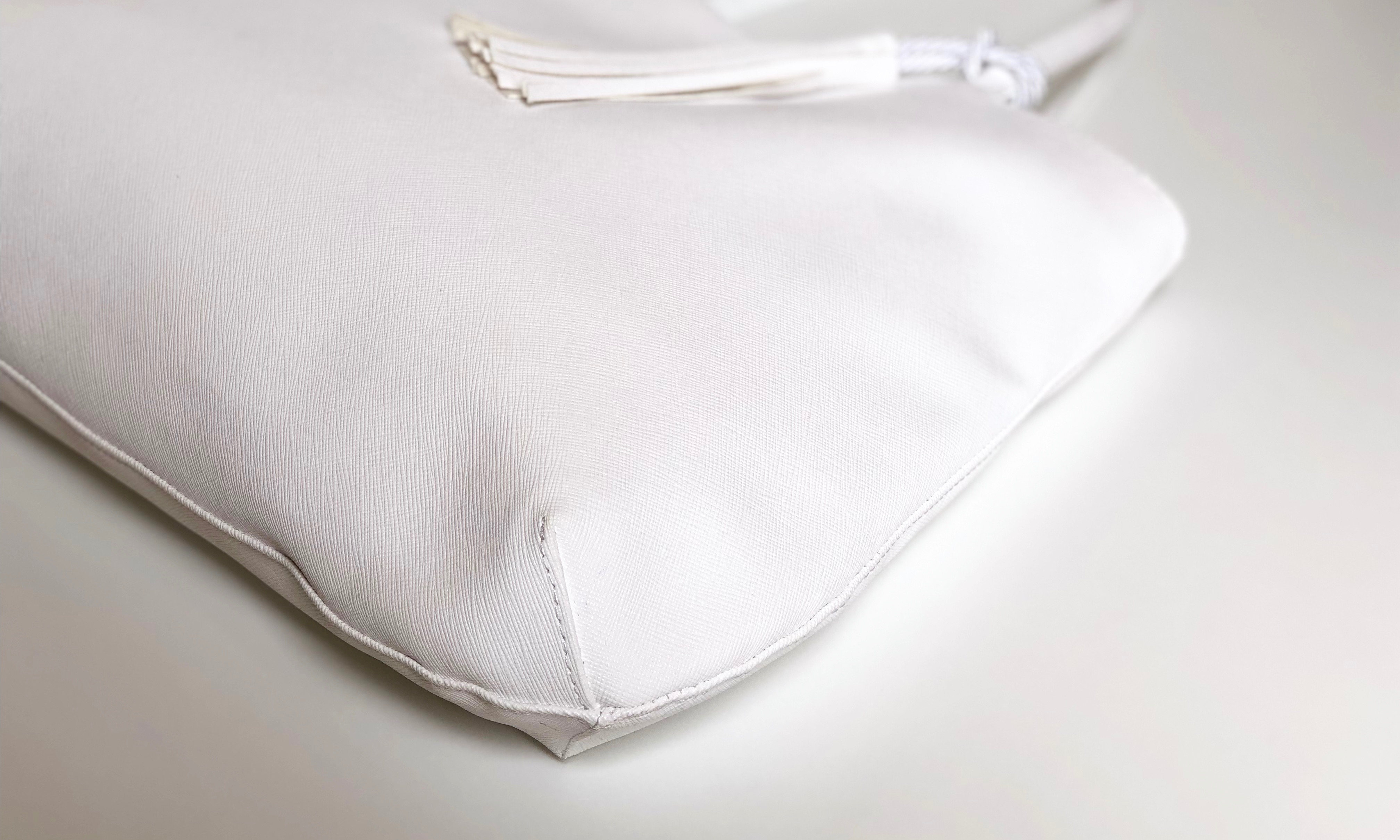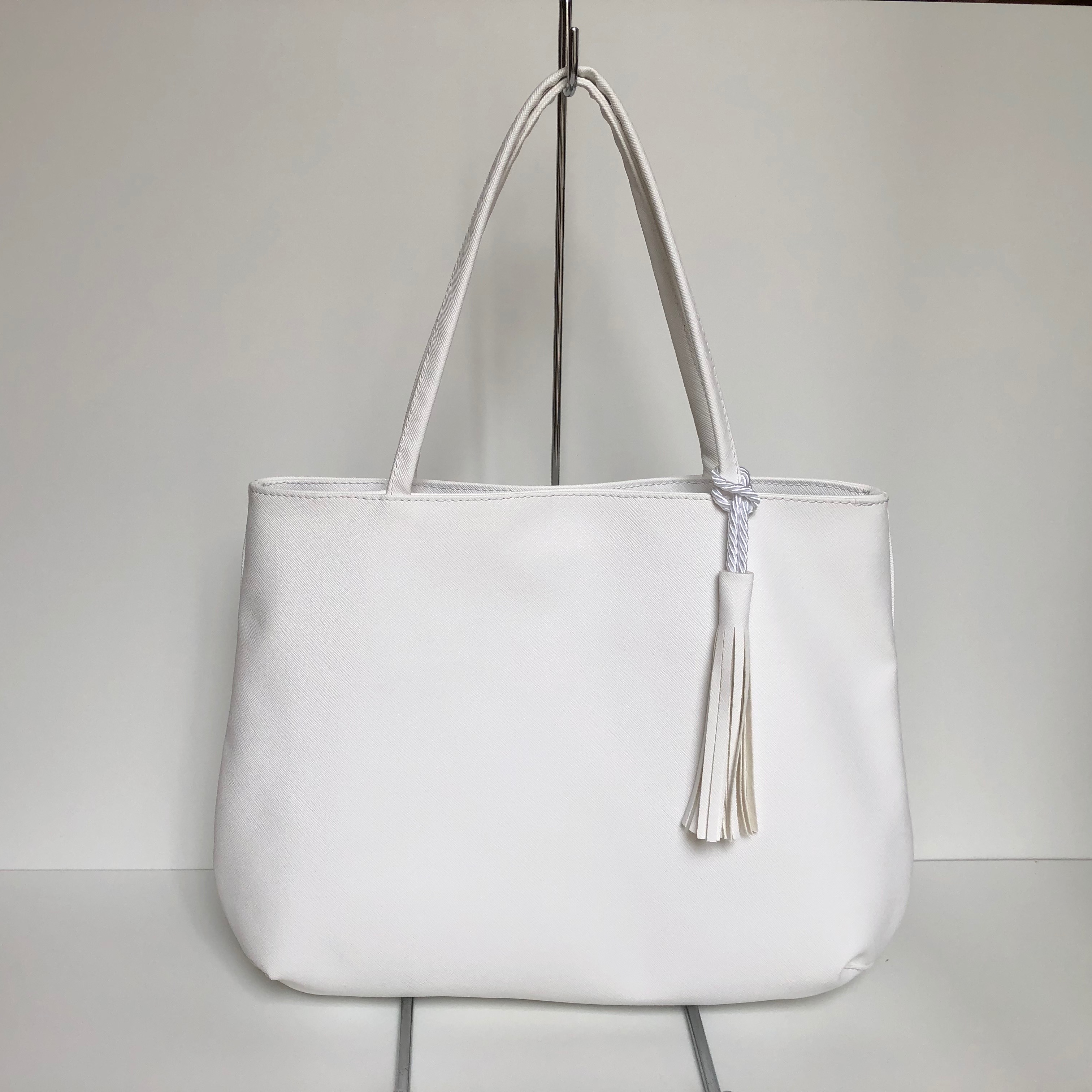 持ってみるとこれくらいのサイズ感になります。マチが薄いので、それほど大きく見えずデイリー使いにも最適です。ぱきっとした白で爽やかな印象です。