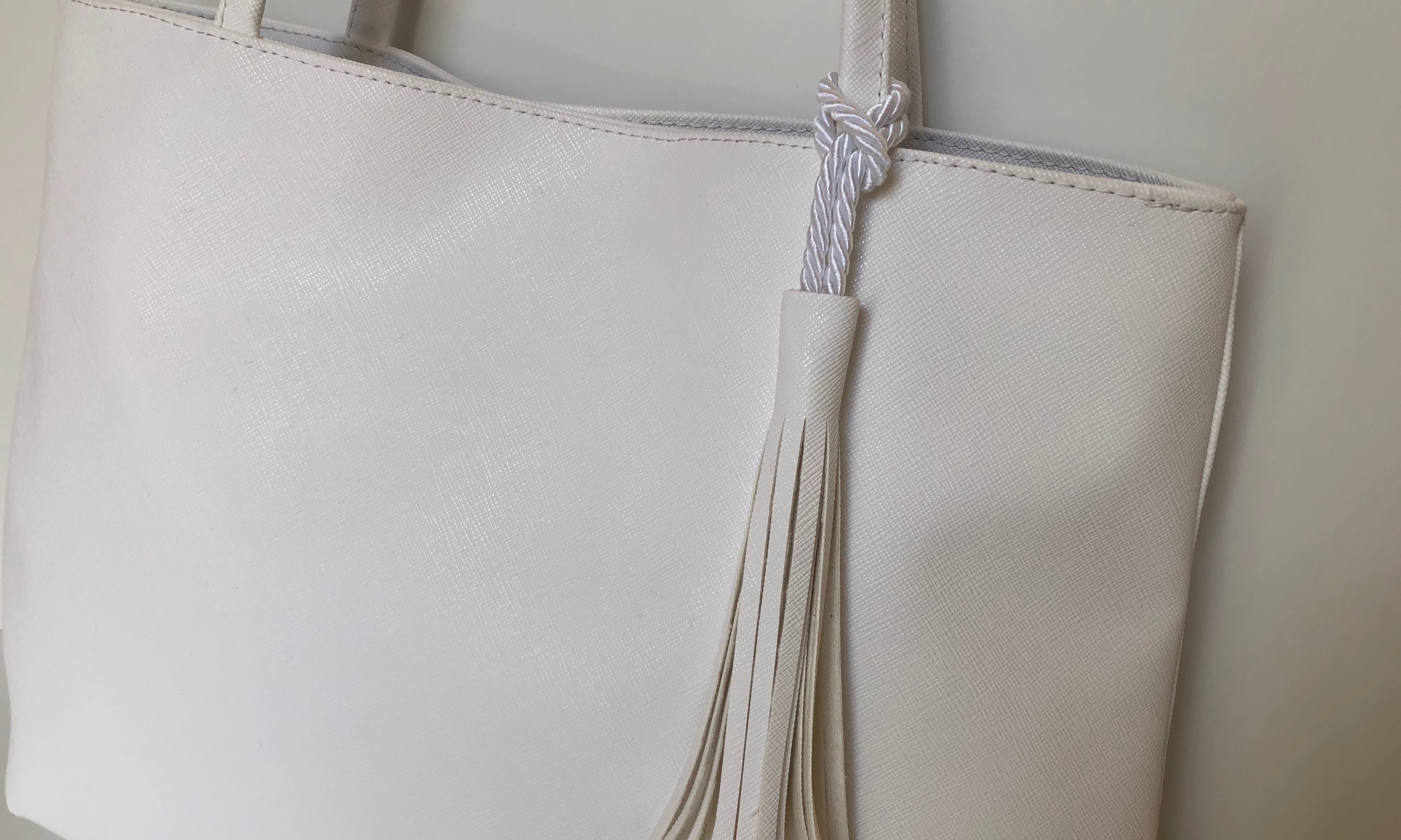 取り外し可能なフリンジチャームは、お好みで。持ち手と底部分はビニールなので、耐久性もありながら、デザインの一部にもなっています。裏地は落ち着いたトーンのオレンジのキルティングで、中を見やすい効果も。