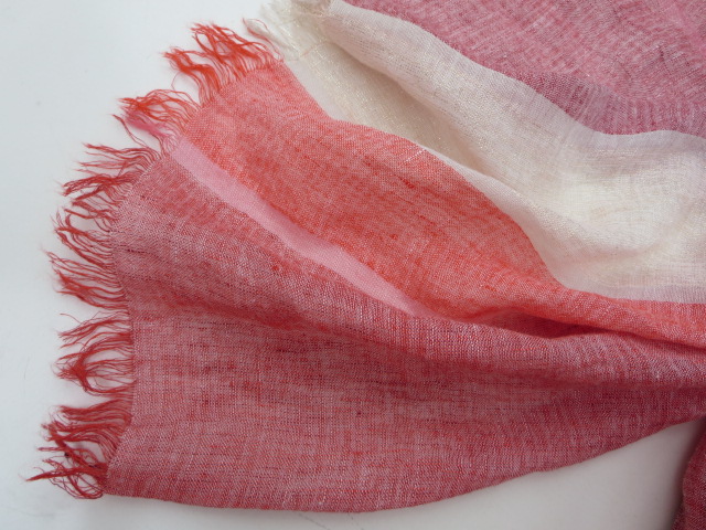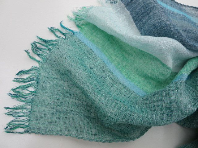 コットン・リネンのストライプ柄の涼しげな雰囲気のストール。ホワイトベースの部分には、さり気なくラメがあって、華やかさもプラスされています。