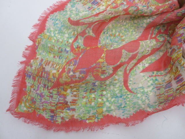 オレンジ&ベージュ&グリーン系の色を使ったペイズリー柄ストール。グリーン系の部分は、水彩画のような繊細な雰囲気。上品で、優しい印象のストールです。リネン混なので、巻いた時もサラッとしています。