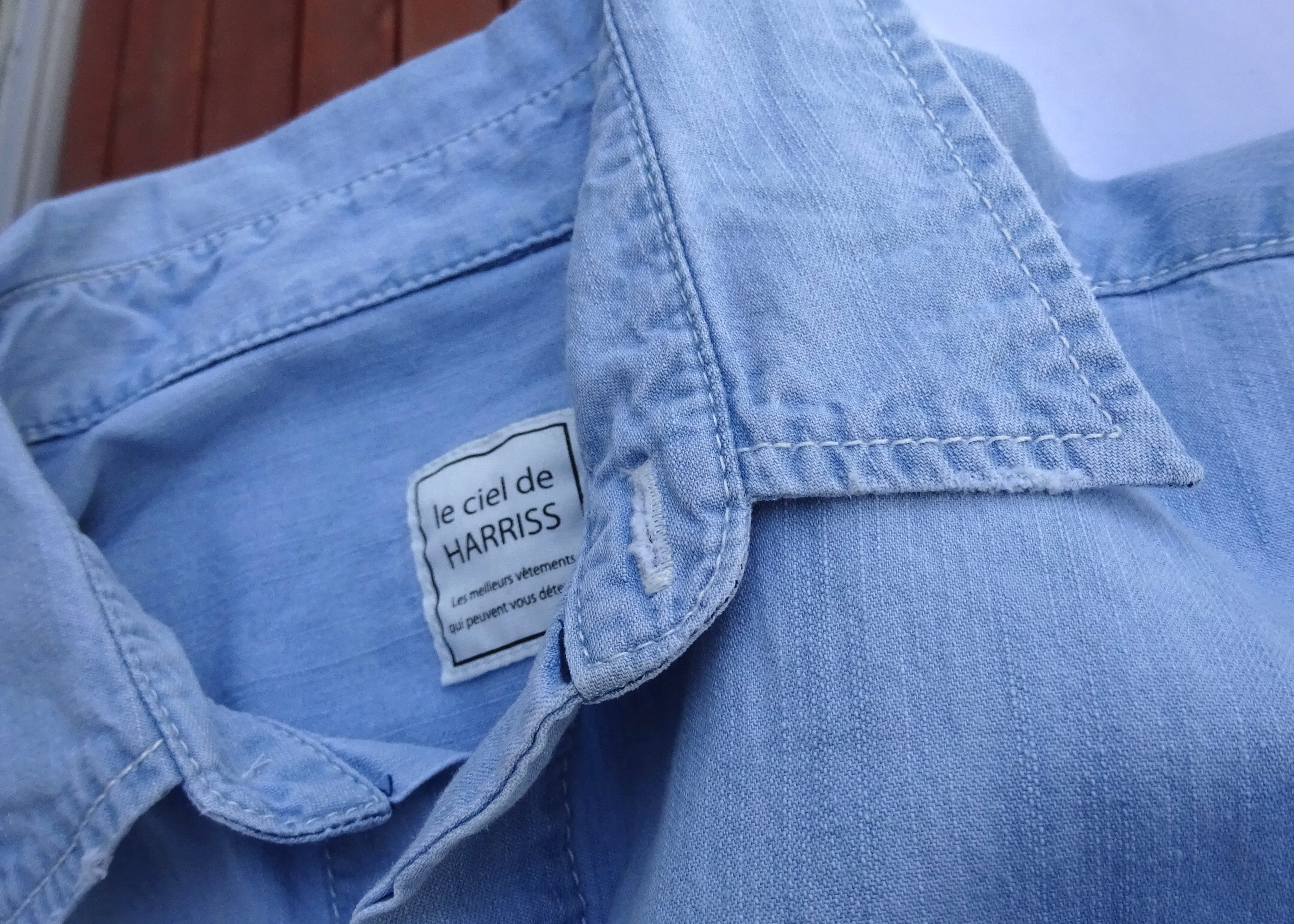 もう1型が、こちらのシャンブレーのタイプです。デニムと同じような雰囲気ですが、織り方が違うので薄くて柔らかな肌触りが特徴。女性らしい淡いブルーはこれからの万能選手になってくれそうな1枚。