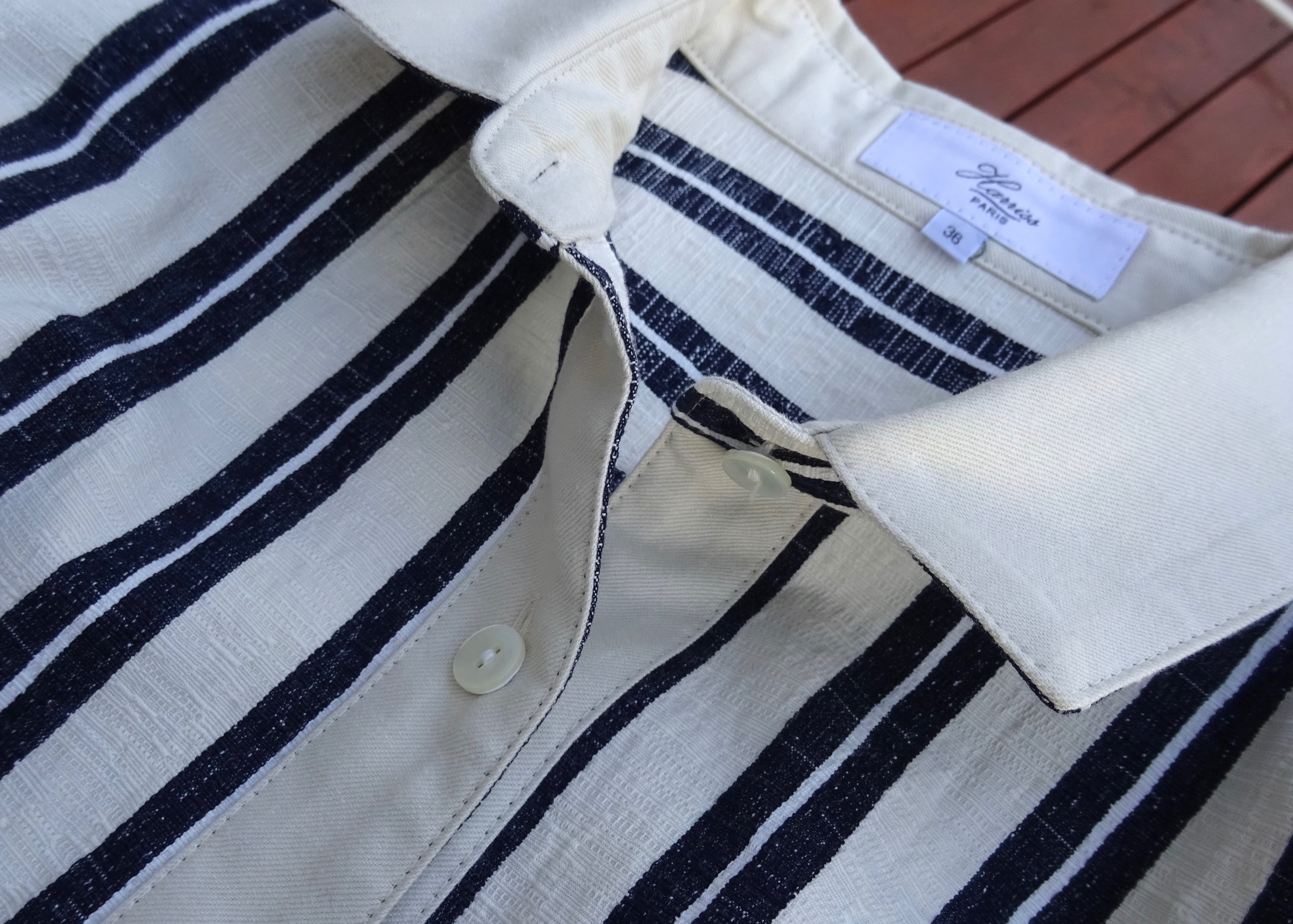 ストライプでも変形ストライプなので、縦のラインを優しく演出。襟、前縦と袖部は無地のオフホワイトでスッキリと。