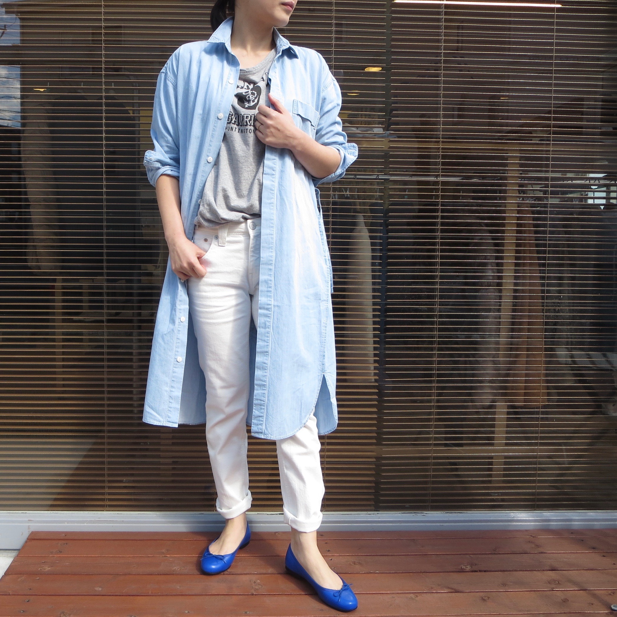 そして、涼感のあるブルーでまとめてみました。太ももやお尻が気になるという方は、こんな感じでシャツワンピースを着ていただければ一石二鳥。カバーしながらスタイルアップも狙えます。