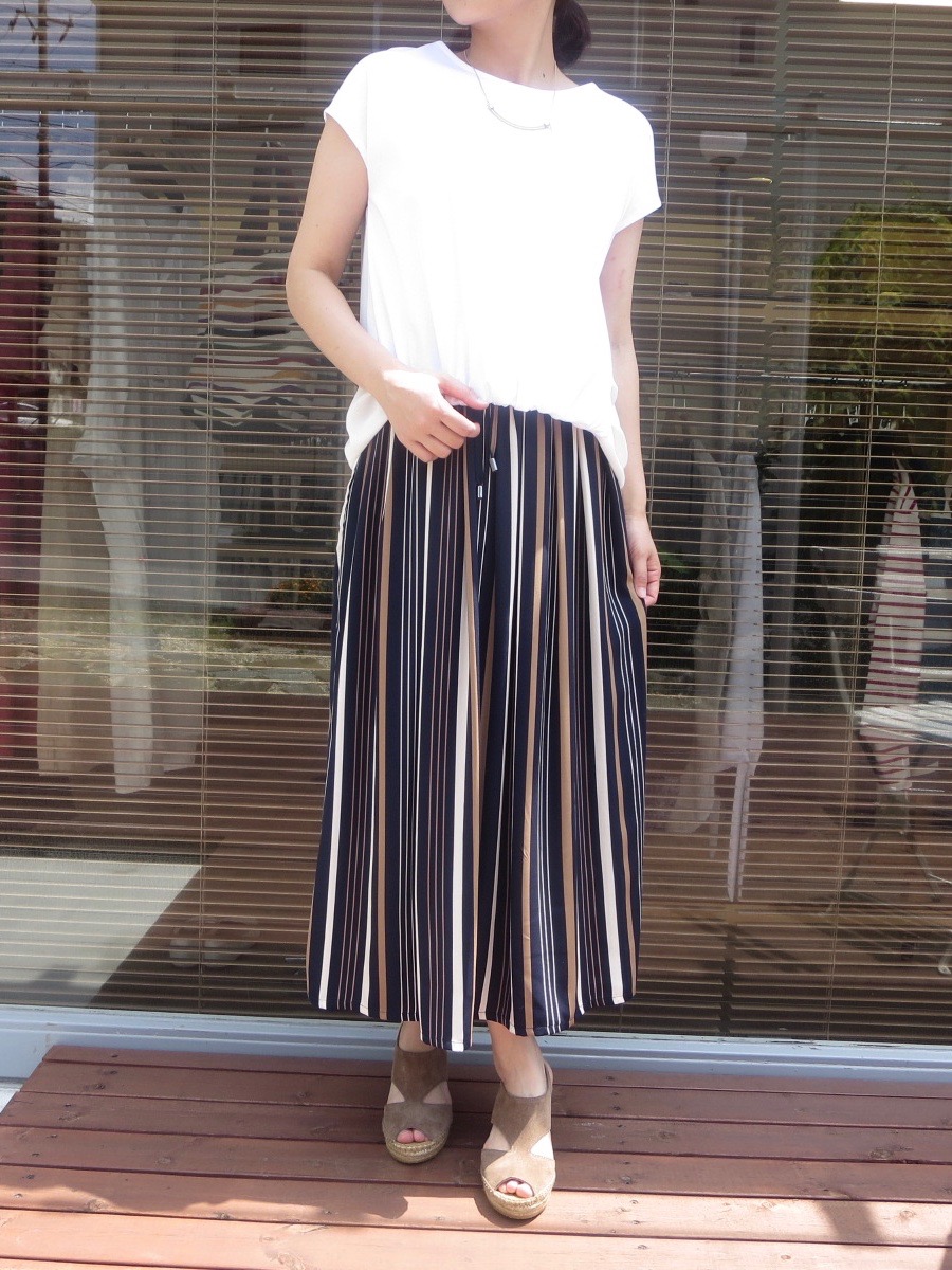 ネイビーベースに、モカと白のラインの幅が異なるストライプが、ランダムに入ったスカートは、落ち着いた雰囲気ながらも目を引きます。