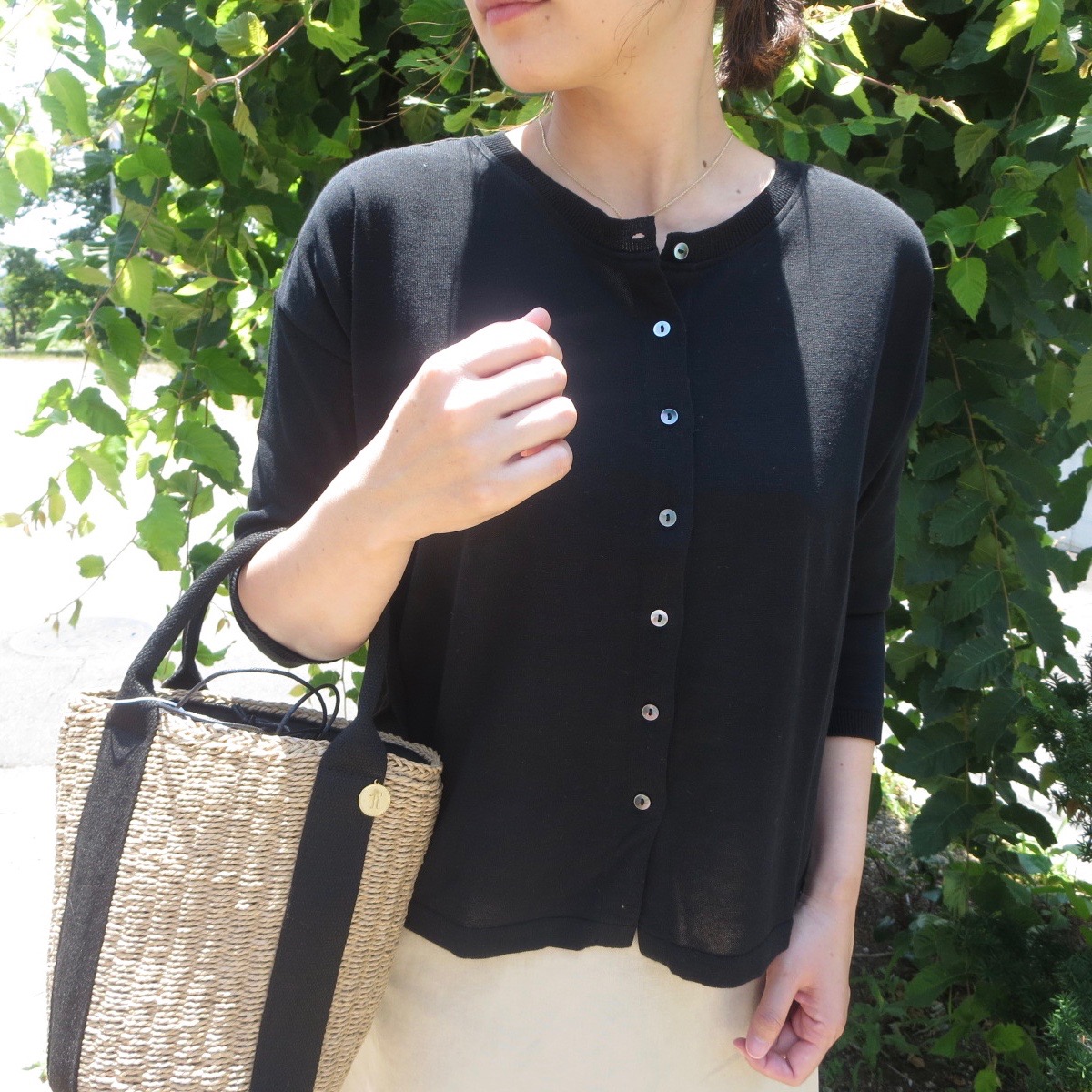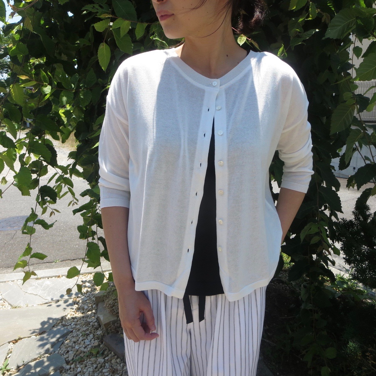 クルーネックのゆったりとしたカーディガンは、前を閉じて着ていただいても肌にフィットし過ぎないので、暑い季節にも快適に羽織っていただけます。