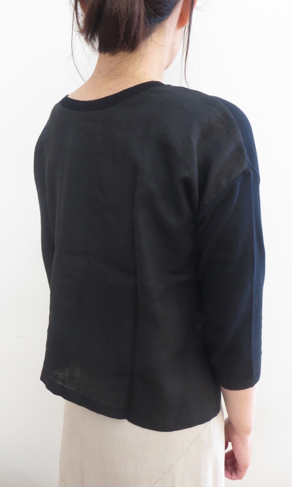 こちらは、クルーネックカーディガンと逆で、前身頃がリネンになっています。Vの開きが深いので、ブラウスの上に羽織っていただいても首元がすっきりです。