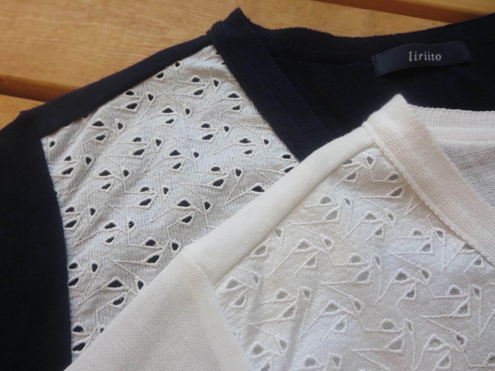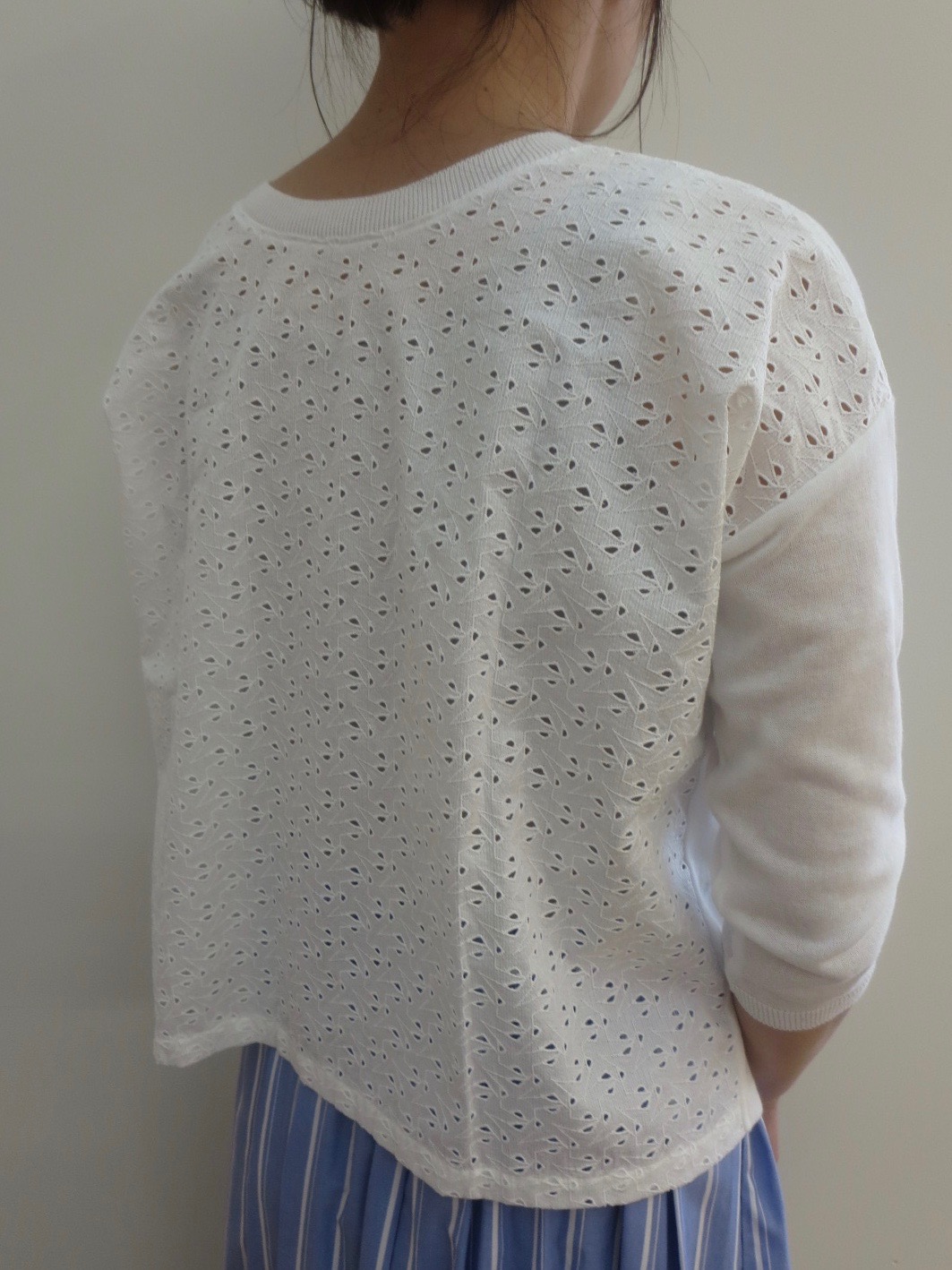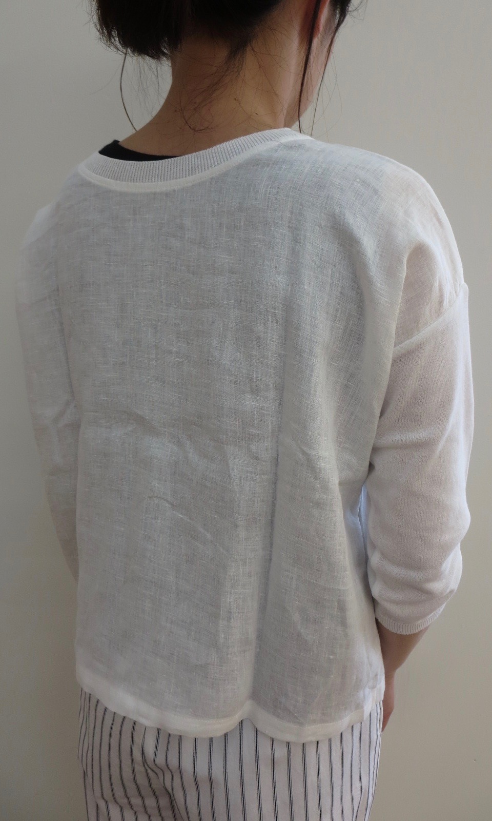 前から見るとニットのカーディガンですが、後ろはリネン素材ですので、まるでブラウスを着ているようです。