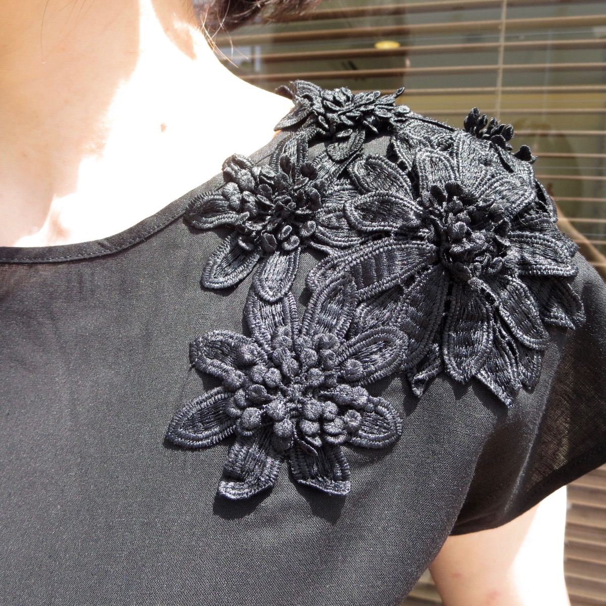 レースで作られた花モチーフが、左肩に施されています。透け感のある綿×麻のプルオーバータイプのブラウスは、カットソー感覚でさっと着られるのに、上品な印象です。
