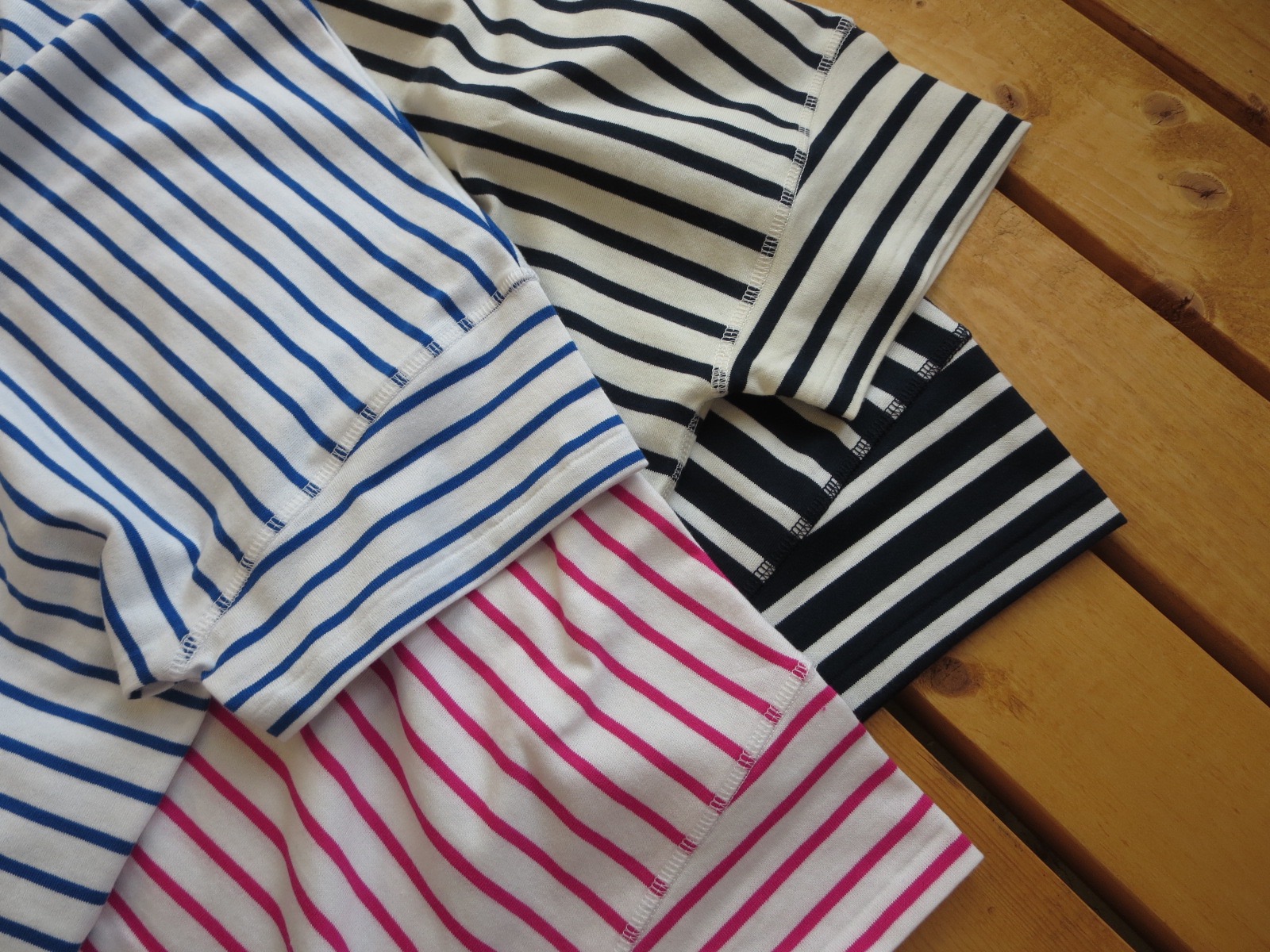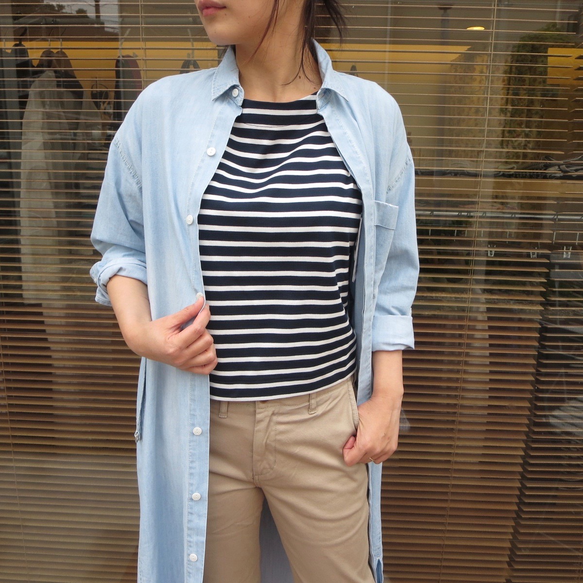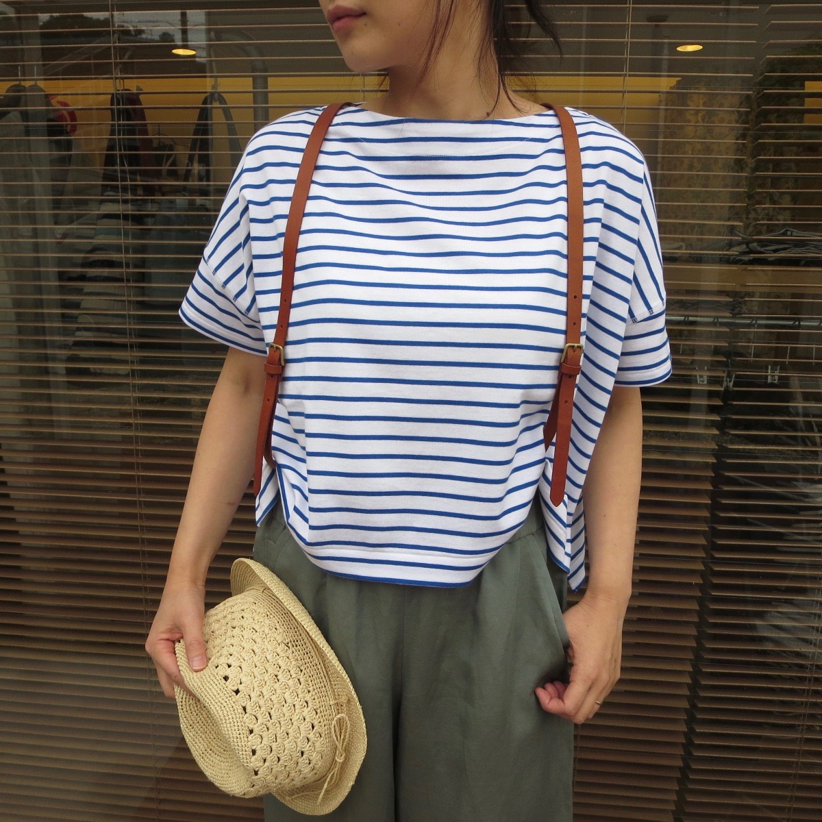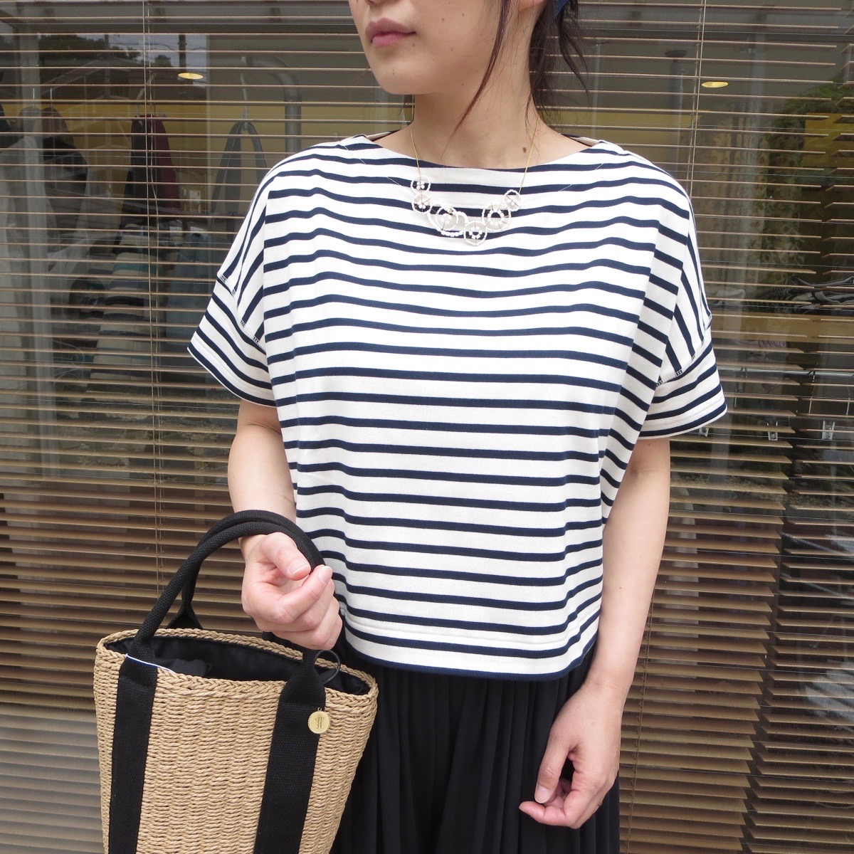 次にご紹介するのは、ボートネックでゆったりとした丈短めタイプのボーダーです。今年人気のボリュームのあるボトムともバランスが取りやすくなています。