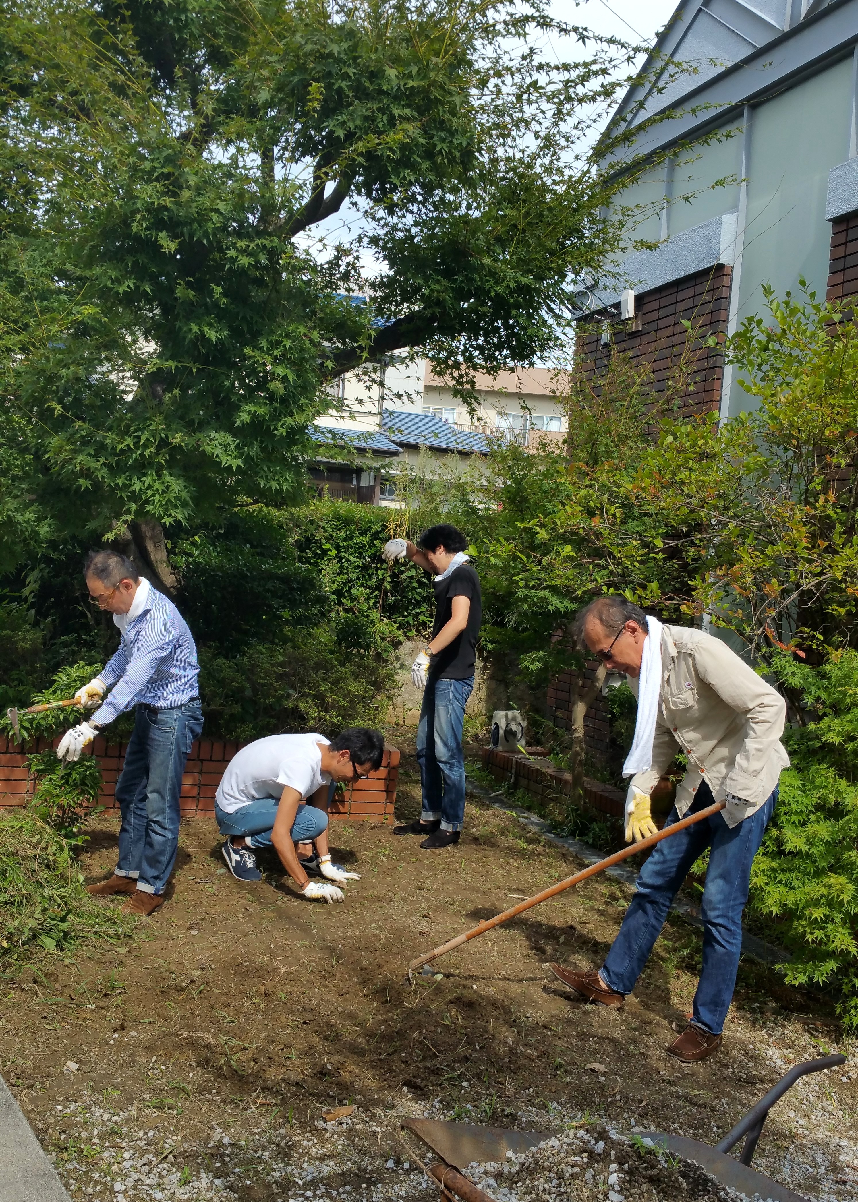 雨天が続いた合間の晴れの日、新しいcachette/カシェートの為にメンズ店スタッフが草取りをしてくれました。普段ガーデニングや畑仕事とは縁遠そうな方々が、スコップや鍬を片手に、しかもこんなにおしゃれな出で立ちで、、、。突然登場したイケメン集団(?)に、蚊や毛虫たちもさぞ喜んだことでしょうね!雌蚊に1番人気だったのがタカイさんのようでしたが、皆さん本当にありがとうございました。こんな感じで、cachette/カシェートの改装工事は順調に進んでいます。