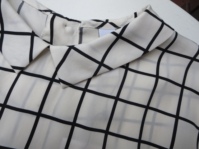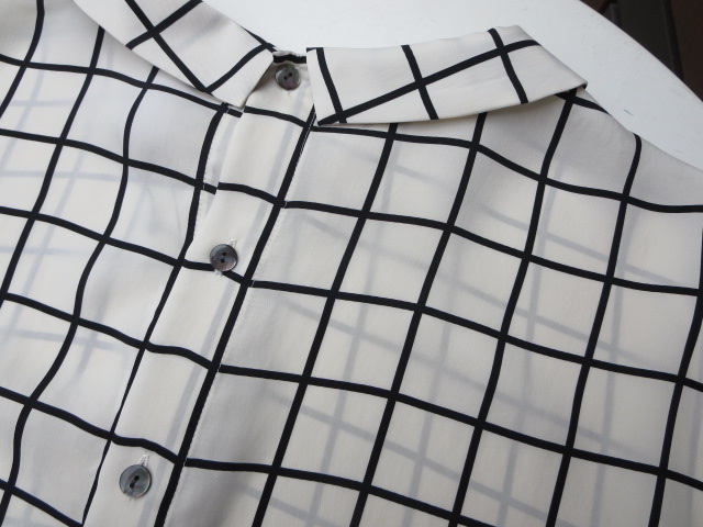 上のワンピースと共地のブラウスもあります!衿が、チョコンと小さくて、またまた可愛いのです。こちらも胸元の切り替えがあり、清楚でクラッシクな雰囲気。ついつい人気のミモレ丈のスカートを合わせたくなってしまいます!勿論、パンツでもOK!重ね着シーズンには、ポイント使いに良い感じです。クルーネックニットから、可愛らしい衿を覗かせても素敵ですね。