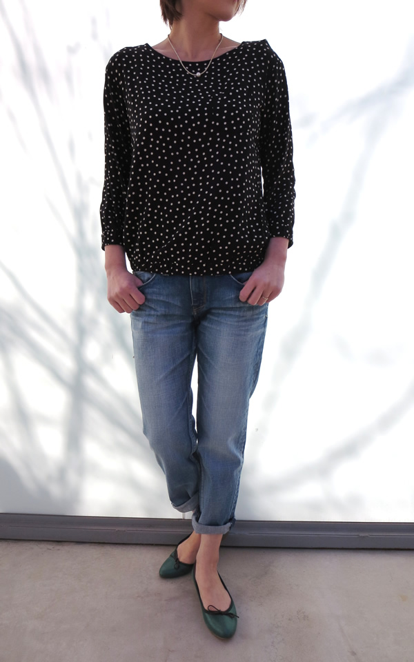 レーヨン100%の柔らかな素材感が、大人っぽい雰囲気のブラック×ホワイトのドット柄のブラウス。袖と裾には、ゴムが入っているので、ふんわりシルエット。ボトムは、スカートでも良い感じですね。(ちなみに写真のボトムは“YANUK”です)