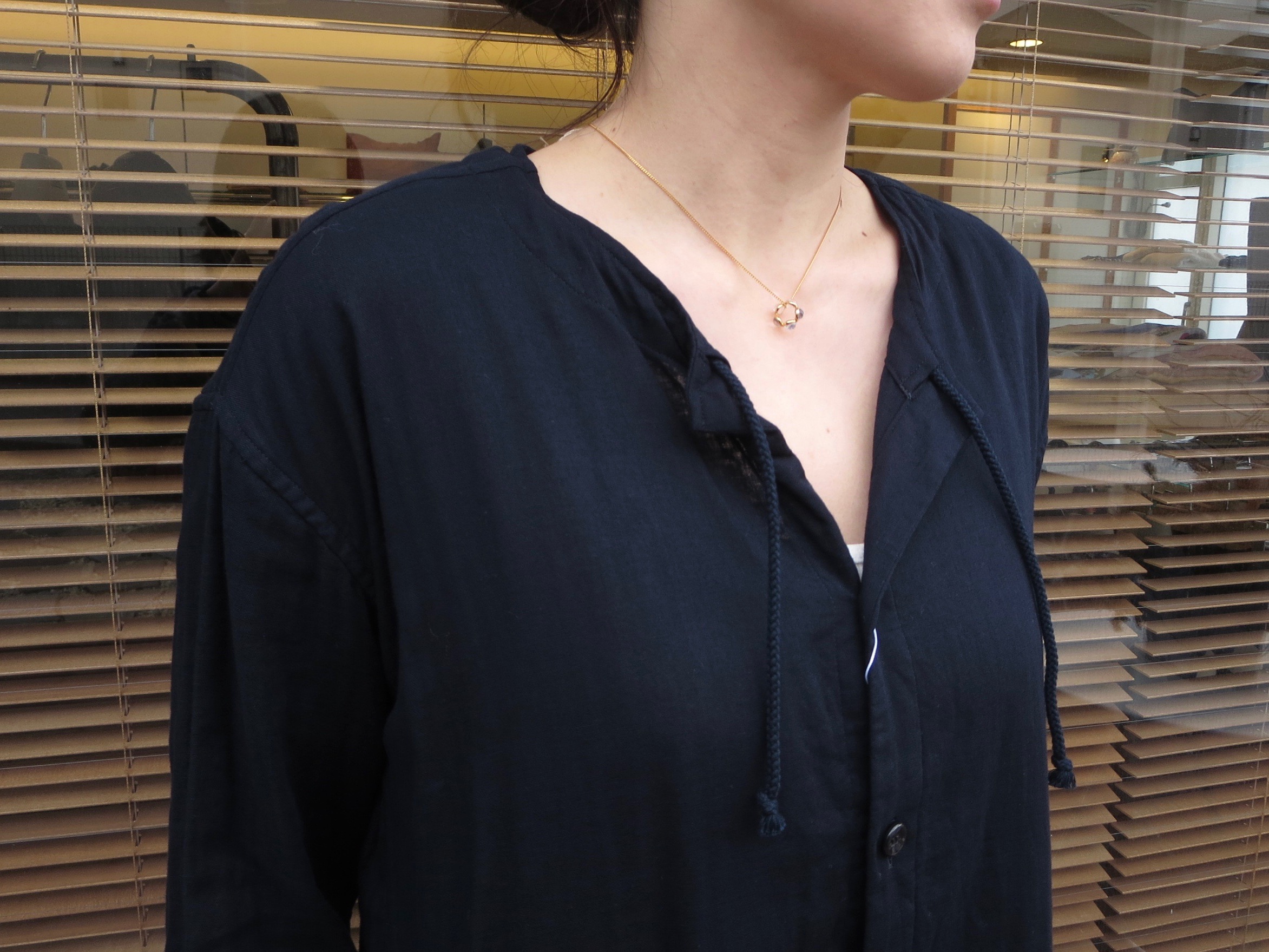 襟元には同色の組紐があしらわれています。気取りのない素材なので、シンプルなアクセサリーや巻物との相性抜群です。キャミソールやTシャツでアクセントをつけても◎。