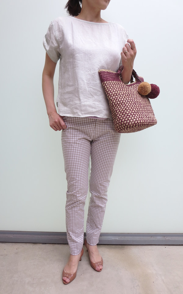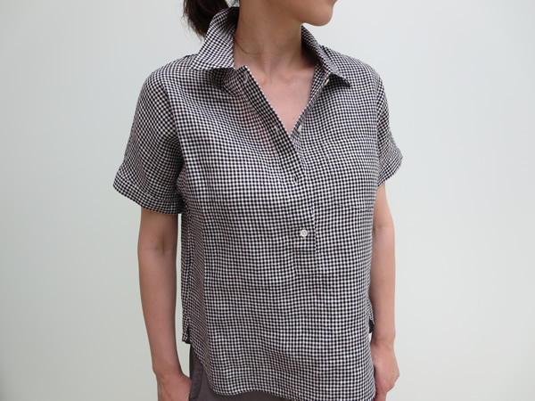 プルオーバーのリネンシャツ。肩に切り替えがなく、着心地も◎。細かなギンガムチェックも大人っぽく着ていただけそうですね。