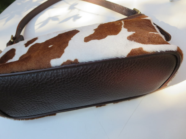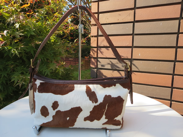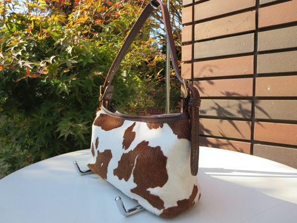 上と同じく、ハラコにドット柄の少し大きめショルダーバック。こちらは、マチもあり、収納力もあるので普段使いでも大丈夫です。ベルトを調節して頂ければ、斜め掛けも出来ますよ。