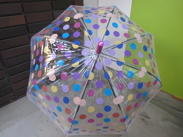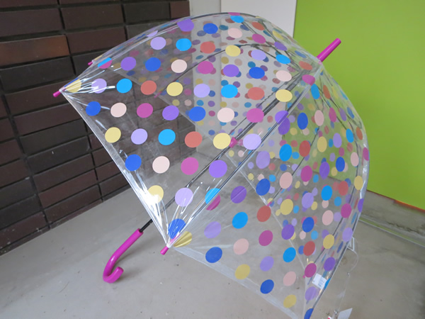 こちらも【バードケージ】のカラフルなドット柄。以前テレビで紹介されて、アッという間に売れてしまった超人気柄だそうですよ!持ち手は、ピンク。