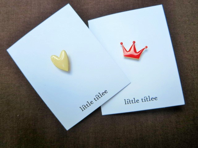 こちらもエナメル加工された可愛らしいピンバッチ。余りのキュートさに、また!選んでしましました。遊びの効いたアイテム達がとっても魅力的。 【ハート】・【王冠】