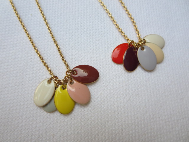 エナメル加工された小さなサークルたちで作られたネックレス。色の組み合わせが、絶妙に可愛いんです!動くたびに揺れて表情も変わり、素敵にに仕上がっています。