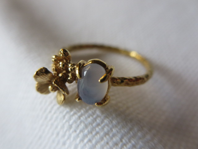 こちらは、紫陽花とブルーカルセドニーのリング。小ぶりなカンジが、大人可愛らしくて、素敵です!
