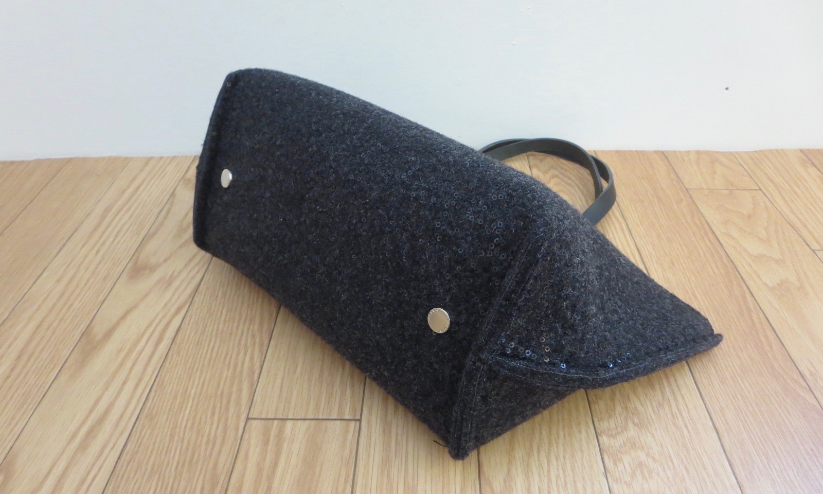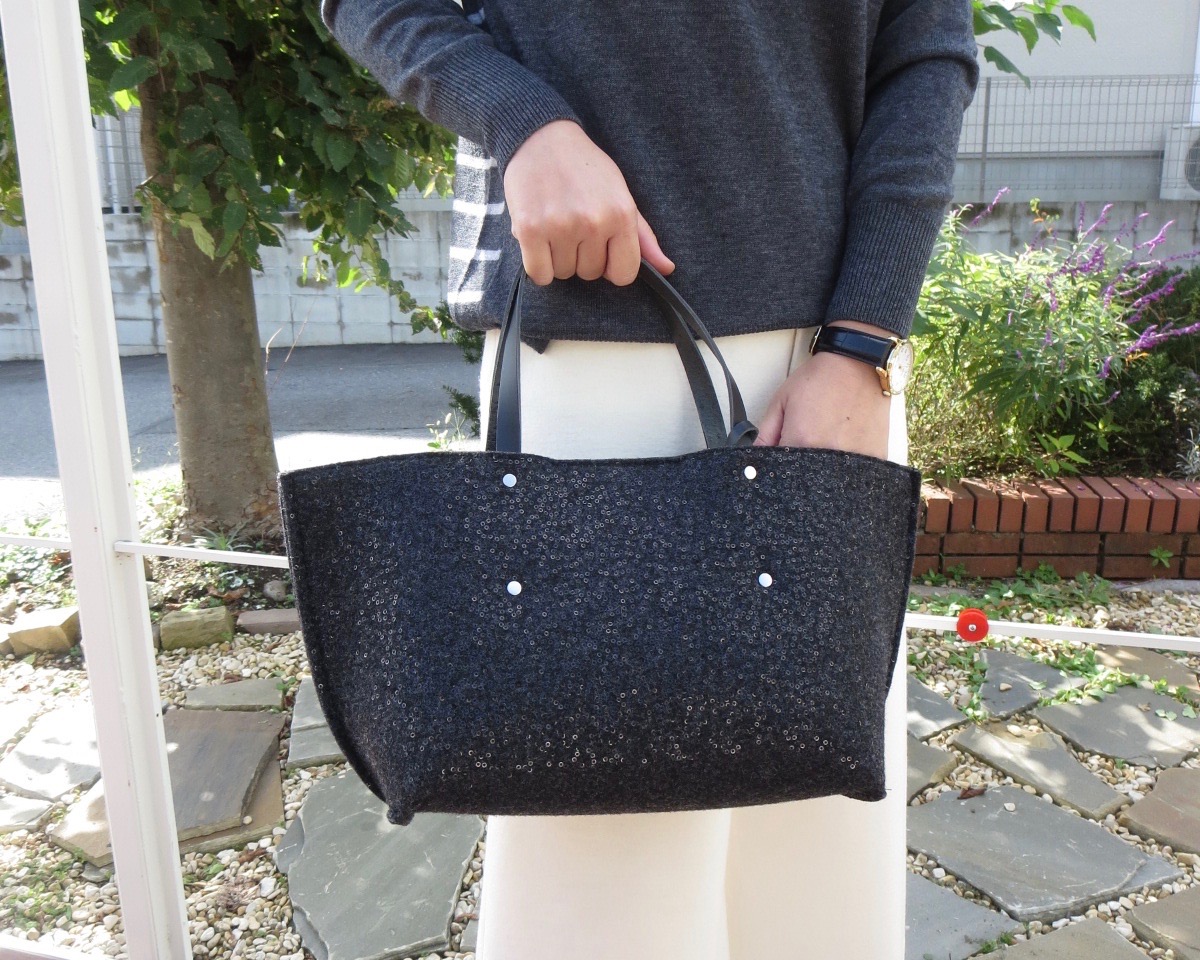 目の詰まったフェルト素材を使用し、こちらのチャコールグレーには、細かなスパンコールが散りばめられ、バッグが揺れる度に、キラキラ光り高級感が漂います。