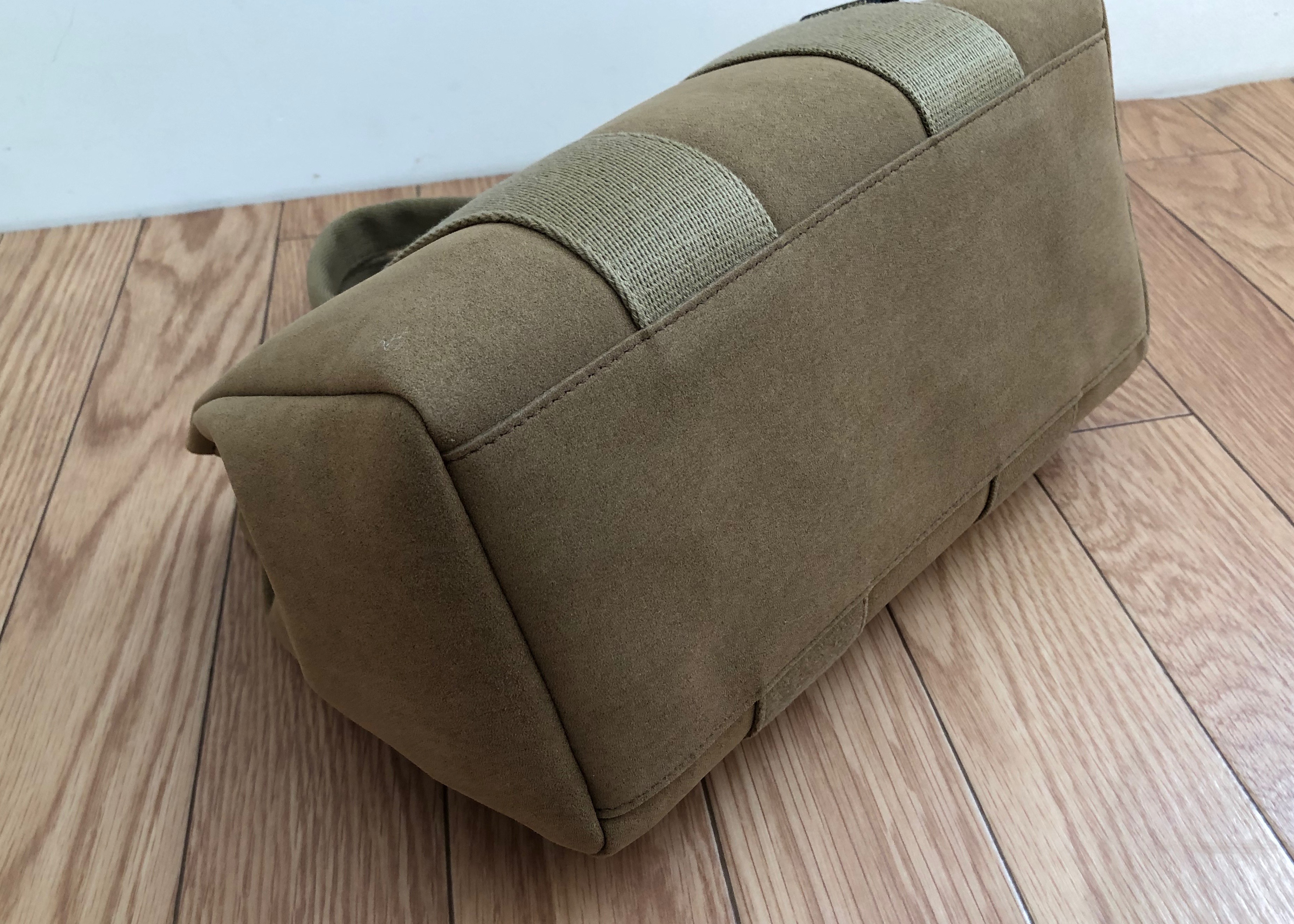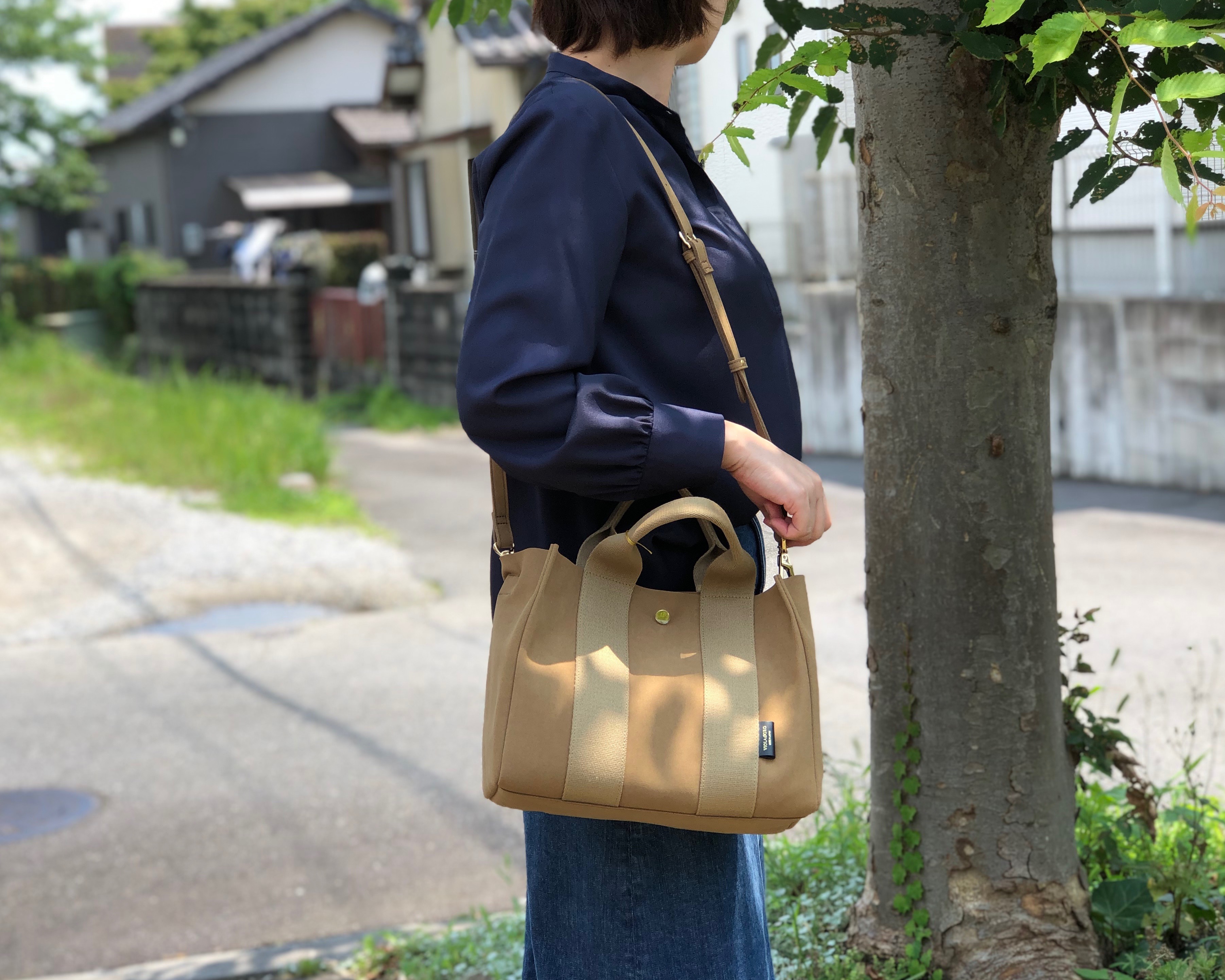 ハンドル&ストラップの2Way仕様。ボディーはマイクロファイバースウェードで持ち手はコットンキャンバス。小さめのサイズがデイリーに使える万能バックです。
