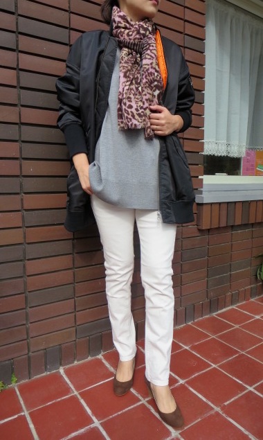 今度は、パンツと組み合わせてクールなコーディネートで。中綿入りで暖かさもキープしながら、おしゃれも楽しめるアウターです。