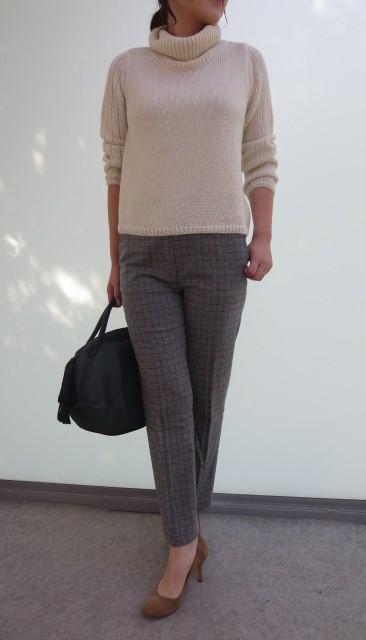 天然アルパカのナチュラルな風合いが、素敵なタートルニット&スッキリとしたチェック柄のパンツ。ニットは、オフタートルで、袖部分は少し透け感があって良いカンジ。ボトムのパンツは、ウール素材で暖か。チェック柄も細かいので、大人っぽくて良いですね。オンオフ使える優秀パンツです。