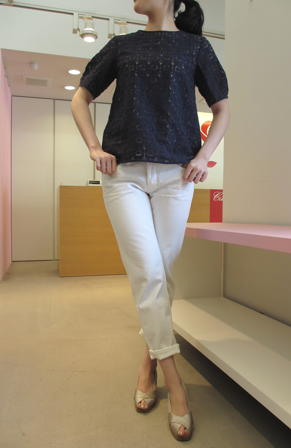 こちらもレースディテールのクルーネックブラウスにホワイトデニムを合わせて大人可愛いコーディネ-トです。