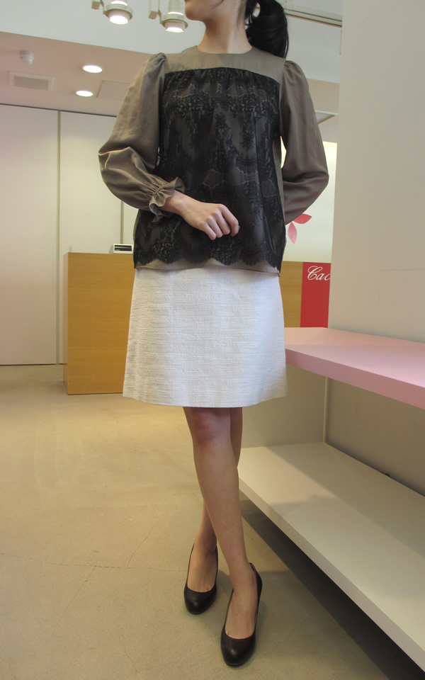 トレンドのレースを重ねた上品なブラウスに、うっすらラメ糸入りの表情豊かな生地が、お洒落なスカートを合わせてキレイ目コーディネ-トの完成!春のお出かけにいい雰囲気ですね。