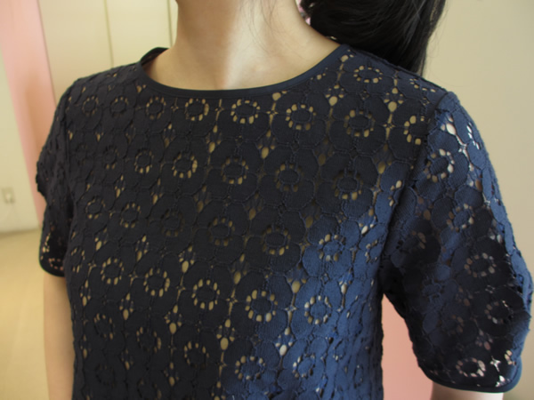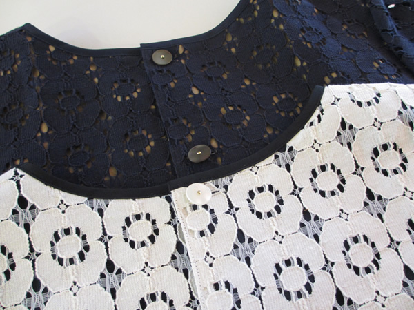 こちらは、フラワー柄のコットンレースブラウス。ネイビーの方は、裏地がべージュで、ホワイトの方は、裏地がネイビー、透け感がとってもお洒落な感じです。